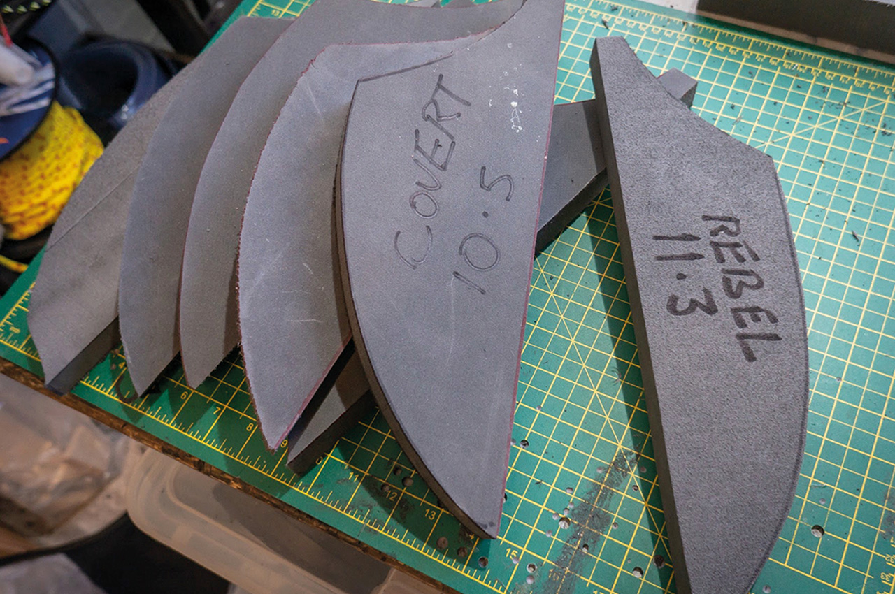 As with shaping your saddle, work to the waste side of the cut lines and refine the shape using a Surfoam tool. Once you’ve achieved the fit required, offer the sidewall to the side of the boat and mark the outline of the sidewall with a marker pen. You can mask off outside the marks if you’re worried about overspray but most glues spray accurately. Apply two thins coats of glue, to each surface (sidewall and boat) allowing each to gas off/touch dry before bonding the sidewalls into position. Always follow manufacturers instructions relating to glue; most glues are hazardous and flammable and need well ventilated space.