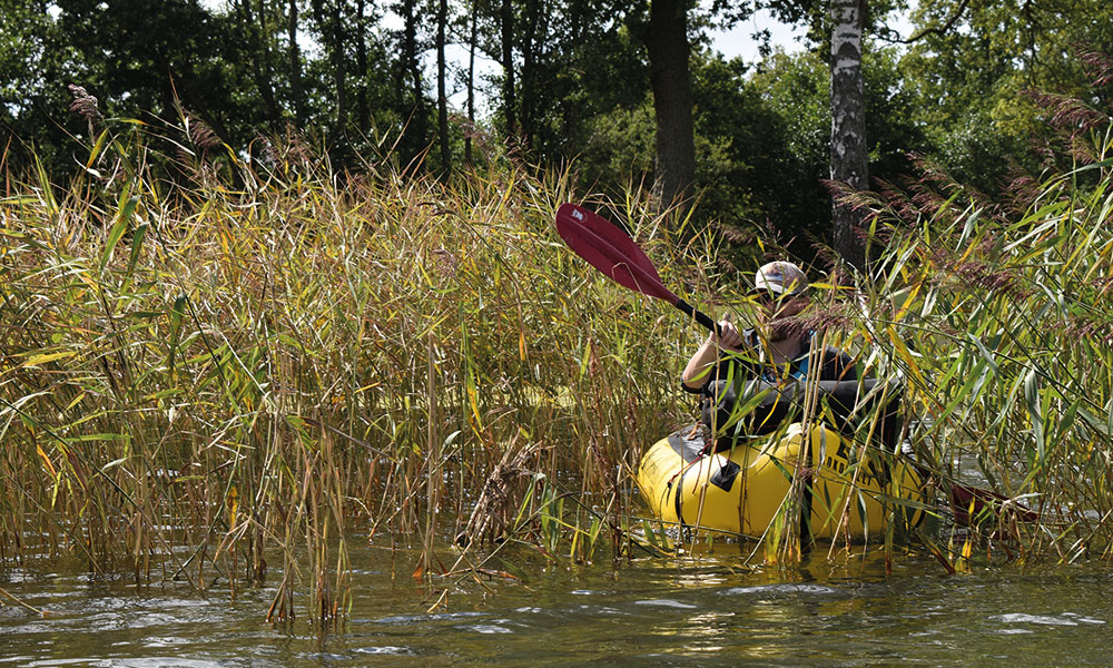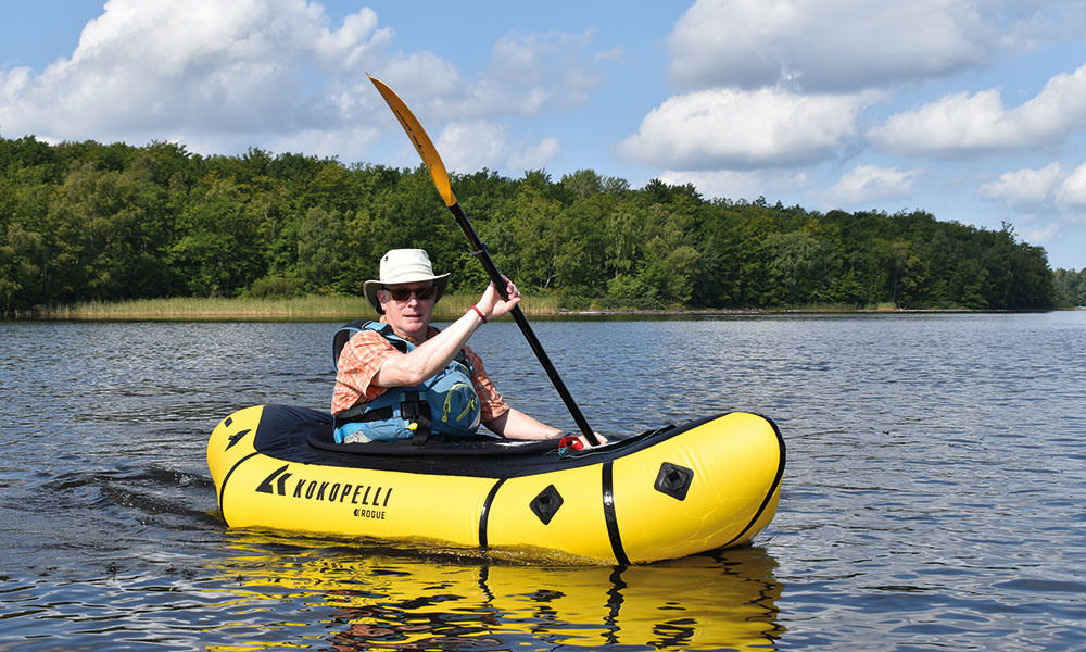 There is high stability on the water, and when fitted with a spraydeck/cockpit, the inside of the packraft stays remarkably dry. Any water ingress is down to your footwear retaining water and shedding it once you sit down. It is recommended to use a longer paddle than a standard river kayak paddle; we found around 215 cm worked well. And for portability when travelling, a 4-piece kayak paddle supports the ethos of transportability.