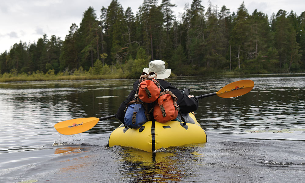 In our packrafts, we gently glided in and out of inlets, enjoying our first paddling of the trip. Our second day trip meant a short drive to see another part of the lake, with a launch at Bosgård, a paddle north along the itinerant canoe trail and after a leisurely lunch, a return to our starting position. Even though on both days the prevailing wind was a westerly, we found no difficulty in packrafting with a Beaufort force 3-4.