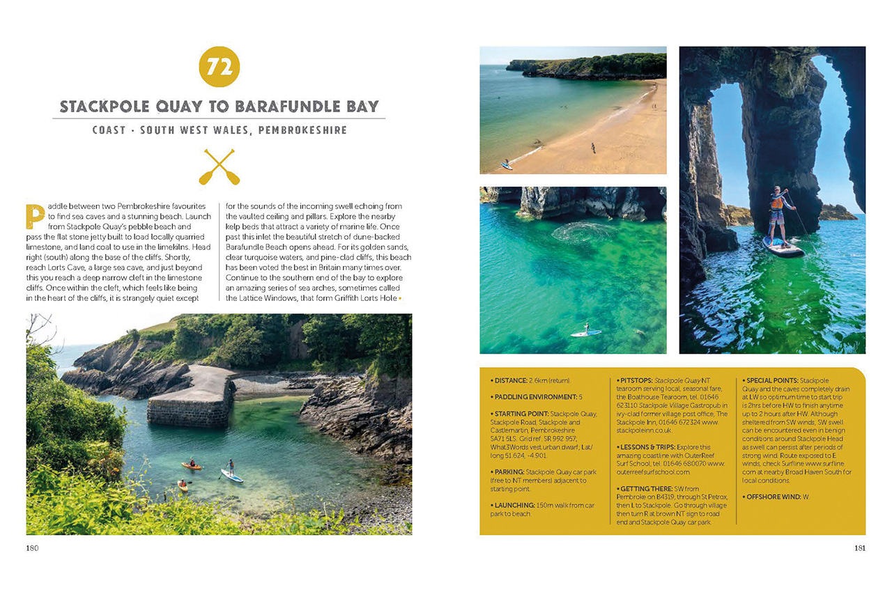 You then have the huge choice of 108 paddles – each route is featured across two pages, with stunning photographs to inspire you to travel and paddle. For each route, there is a clear information box with all the practical advice you need, from a starting point with address, What3Words and Lat/Lon coordinates to parking, launching type, pitstops, local SUP schools, how to get there and special points about the route. Offshore wind direction is given clearly to make sure you know when and if to go out at that location. We thought this was a simple but effective safety tip given on each route with a more detailed explanation of winds earlier in the book.