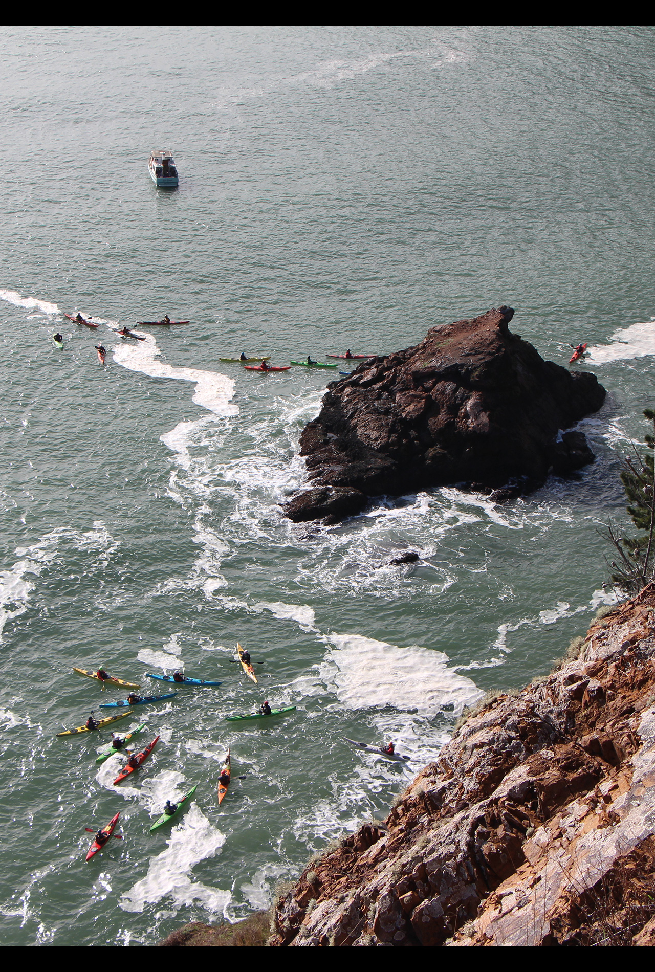 Heading out The Gate, the seas come alive and we find several rock gardening classes including Bill Vonnegut’s ‘Rock Garden Skills and Safety’ getting back on the water following a lunch break at Kirby Cove. We watch these classes as they continue developing a more intimate relationship with swell, current and rock.