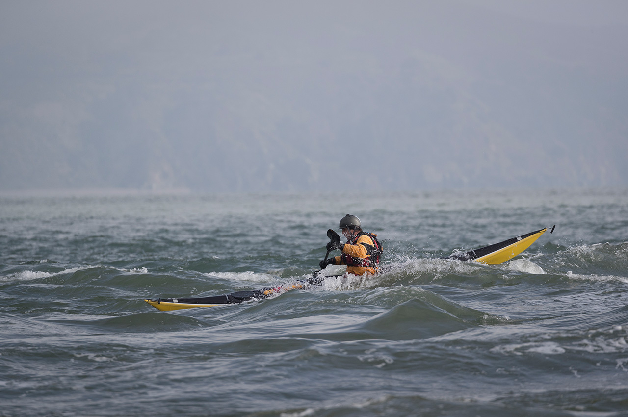 This morning I gear up to be a safety kayaker for Paul Kuthe and David Santaniello’s ‘Advanced Rock Gardening’ class. The swell has dropped so we head to Rodeo Beach rather than paddle out The Gate. Today offers even more variety for students including Kenny Howell’s ‘Surf Ski the Gate’, ‘Sea Kayak Surfing’ with Nick Cunliffe and Chris Bensch, ‘Intro to Surf Kayaking’ with Mathew Hoff and ‘Rescues and Towing’ with John Carmody. Having been a student at a previous incarnation of PGG, The Golden Gate Sea Kayak Symposium, it can be very difficult to select just one class each day. This year is no exception.
