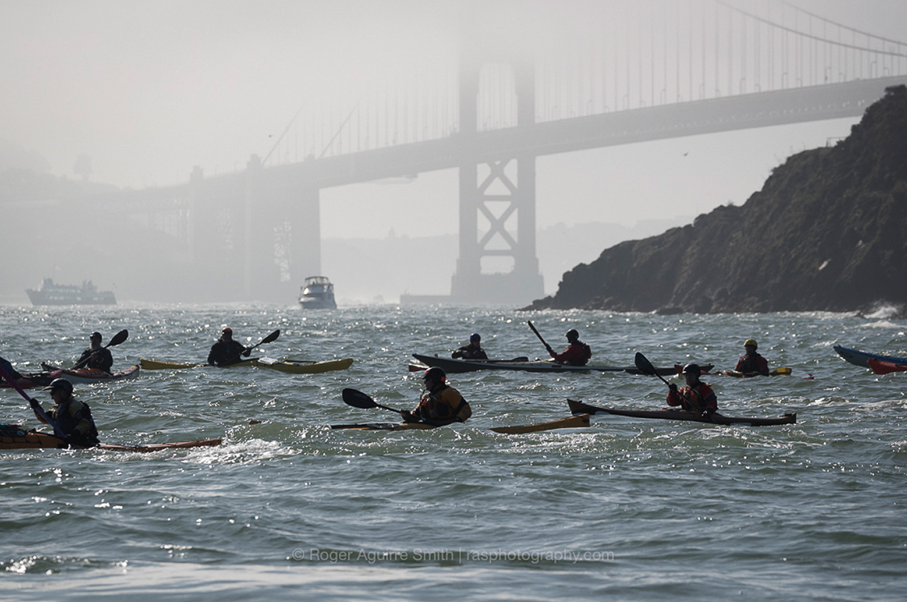 My assignment for opening day is to join Steve Hayward of Sea Trek, as he captains one of two safety boats. I’ll tag along to photograph the day’s event. I toss my camera gear in Steve’s boat and we motor out of the harbour as pods of kayakers begin paddling to their assigned training areas throughout San Francisco Bay. Low fog moves in and out The Gate as clouds float higher among patches of blue sky. The scene is spectacular and remains this way the entire day.