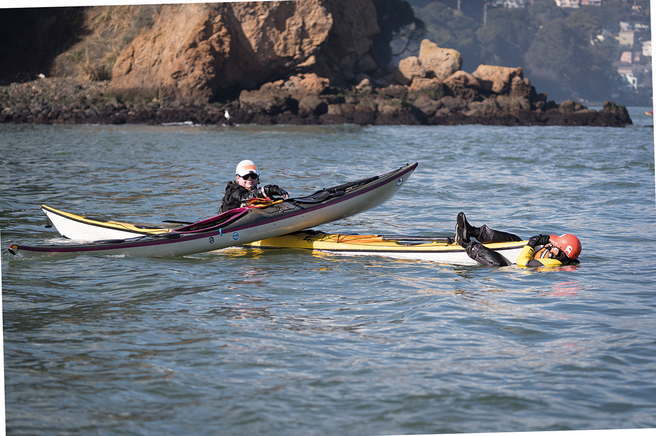 Steve and I push north through an ebbing tide, passing Yellow Bluff and the ‘Tidal Race Paddling’ class and a ‘Rough Water Rescue Skills’ class. Further up the shoreline toward Sausalito, we see the ‘Proficient Coastal Paddler’ class. Our eyes look northeast hoping to catch the glimmer of a kayak or reflecting paddle from Justine Curgenven’s ‘Alcatraz and Angel Island Tour’ as they navigate the tidal race, wind and low visibility crossing Richardson Bay to Peninsula Point.