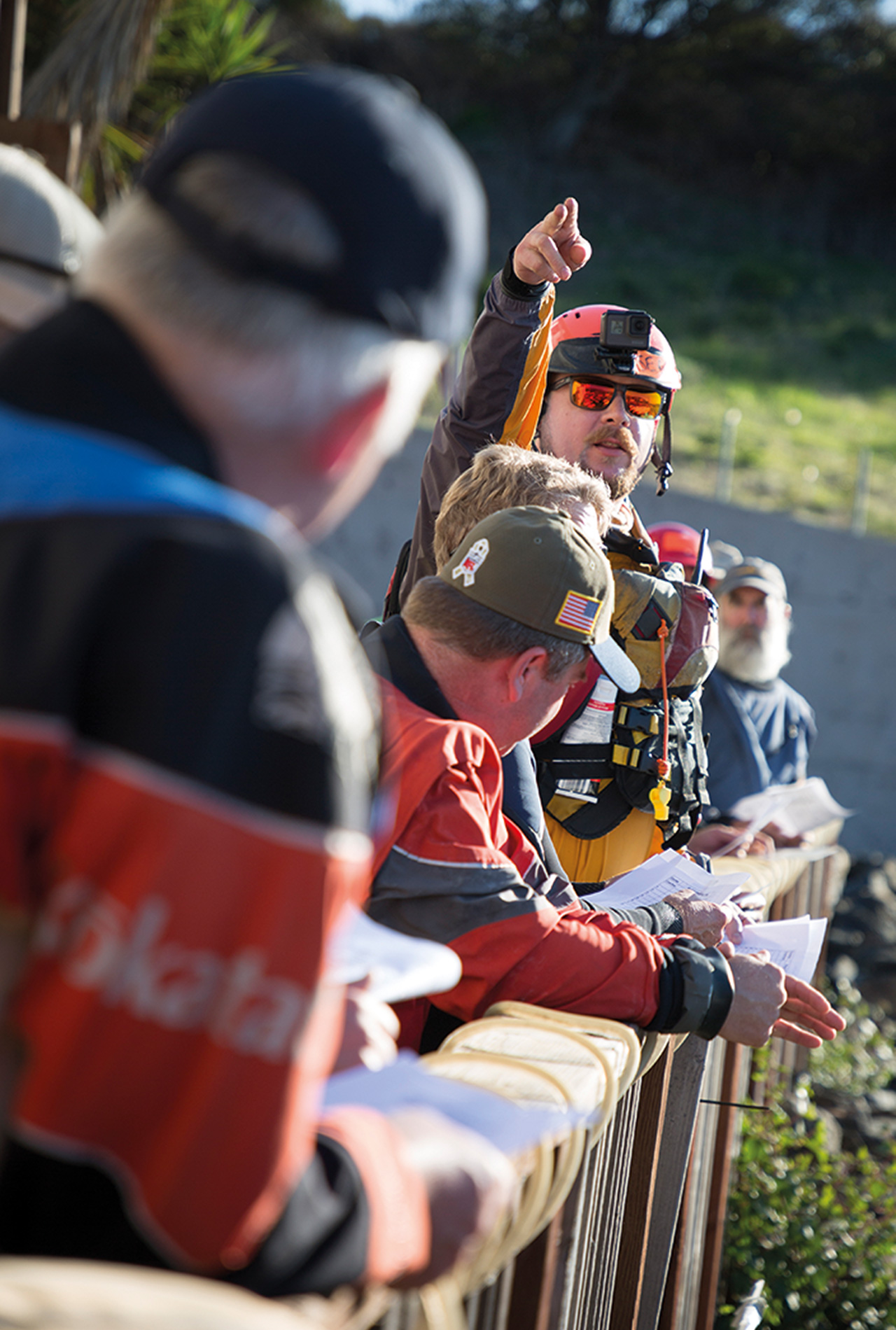 Watching the students gather for the paddler meeting, you can tell their minds are overflowing, their bodies feeling the fun and stress of learning new techniques. Today is another full day with classes that include a US Coast Guard tour, ‘Boat Repair’ with Mike Kowalsky, ‘Incident Management’ with Nick Cunliffe and Bill Vonnegut, ‘San Francisco Waterfront’ with Mark Tozer and Kim Grandfield, ‘Big Water’ with Sean Morley and David Santaniello and ‘Girls Rock’ taught by PGG event organizer, Kelly Marie Henry and Laura Zulliger.