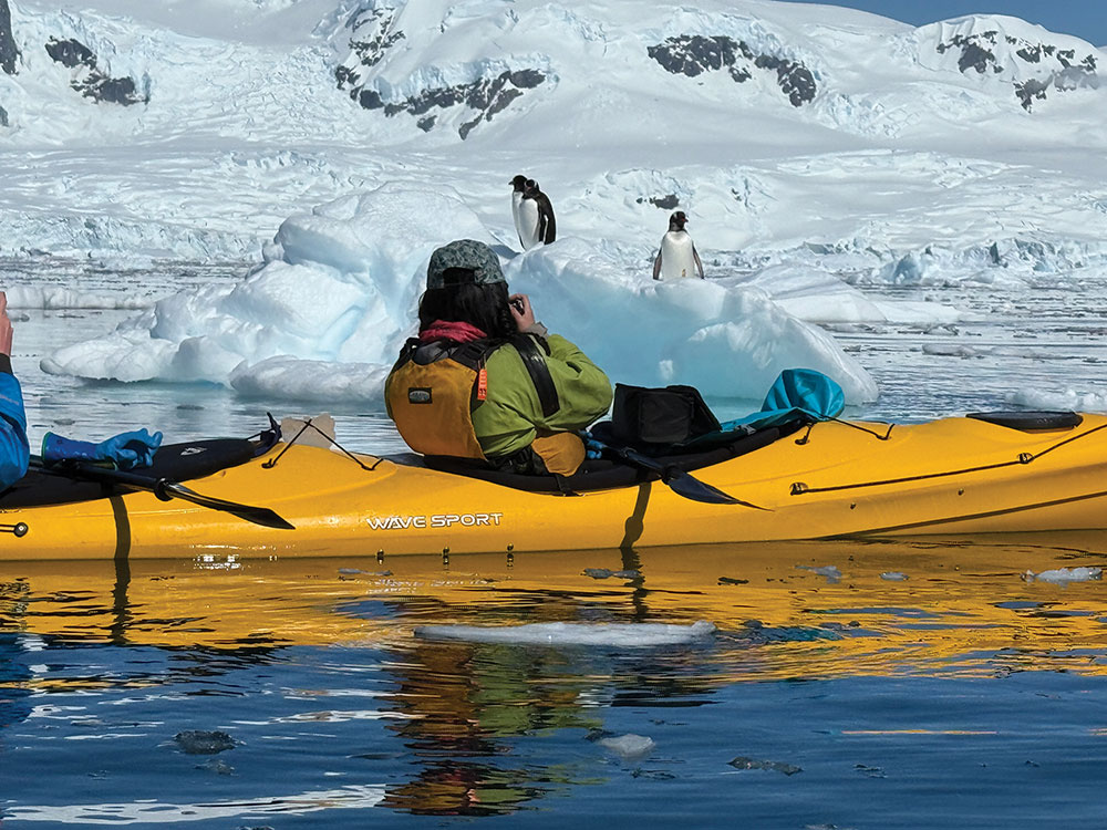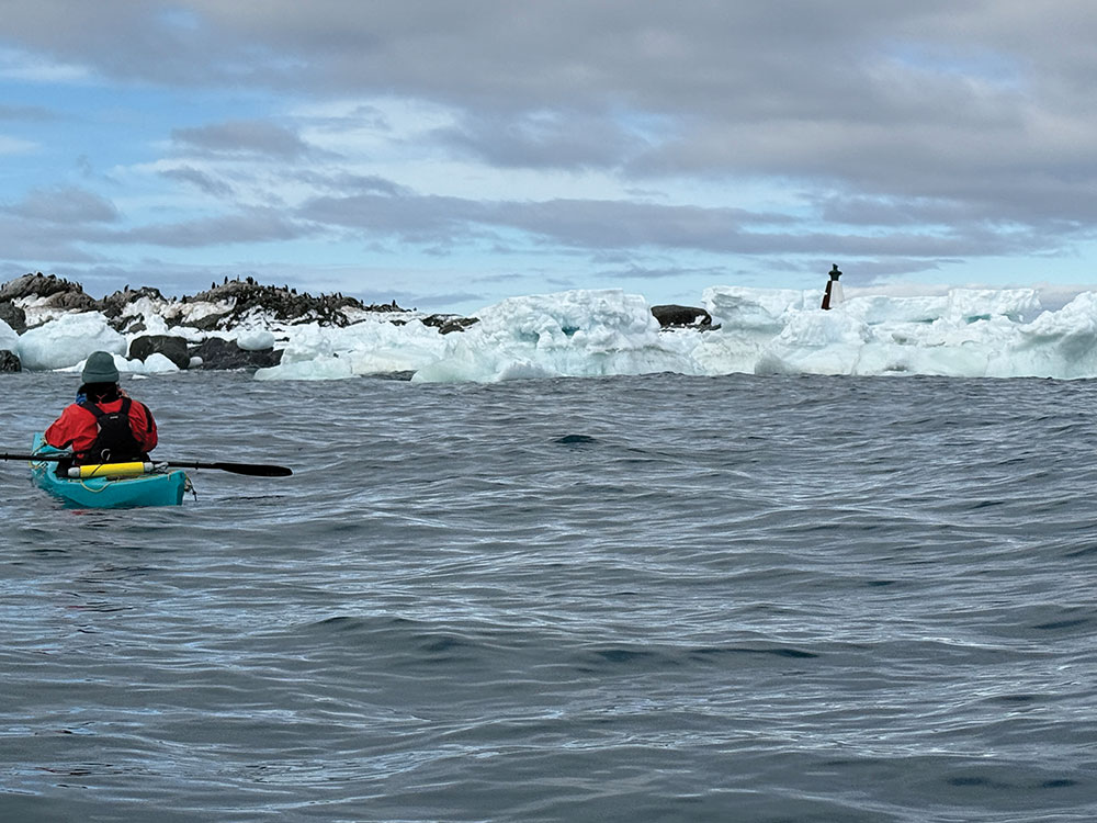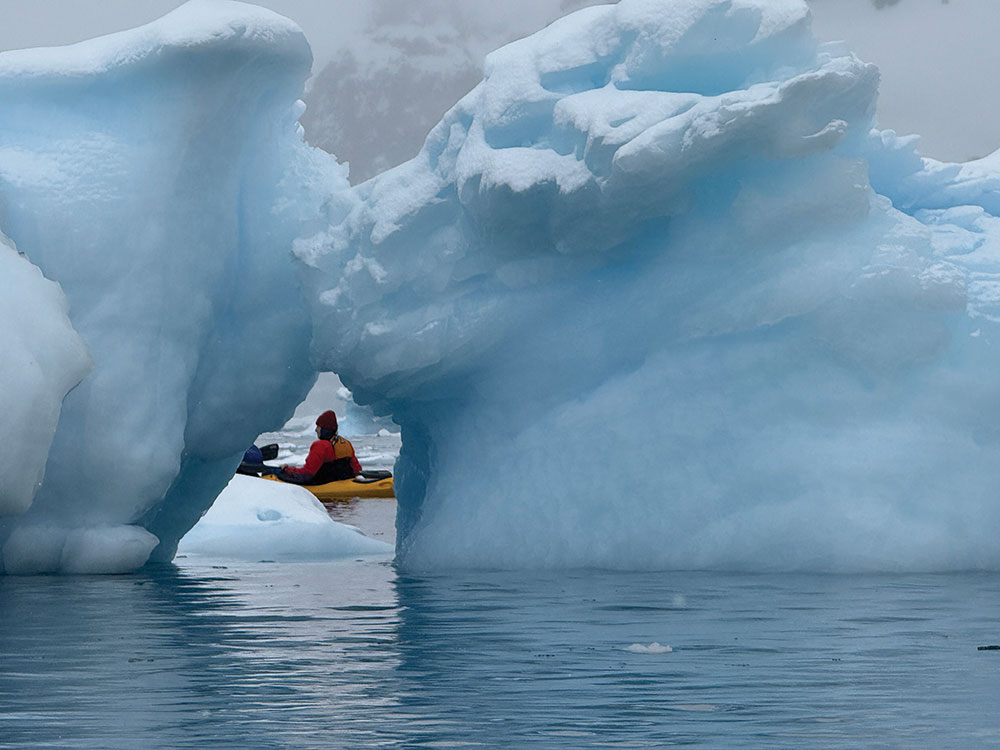 Our own voyage began on the Antarctic Peninsula. We enjoyed several glorious days of sea kayaking, and each launch felt like a gift. The icebergs glowed in deep blue and white. Their fluted walls rose like cathedrals above the kayaks, while brash ice crackled and tinkled as we pushed through it, bouncing harmlessly off our plastic hulls.