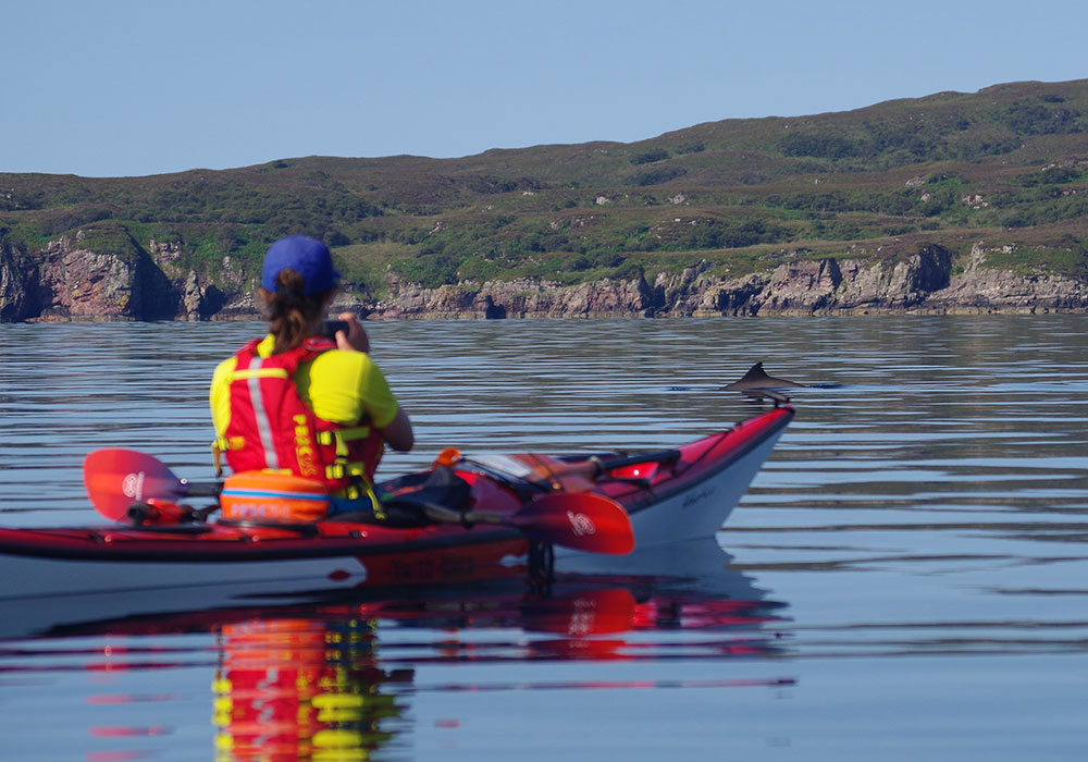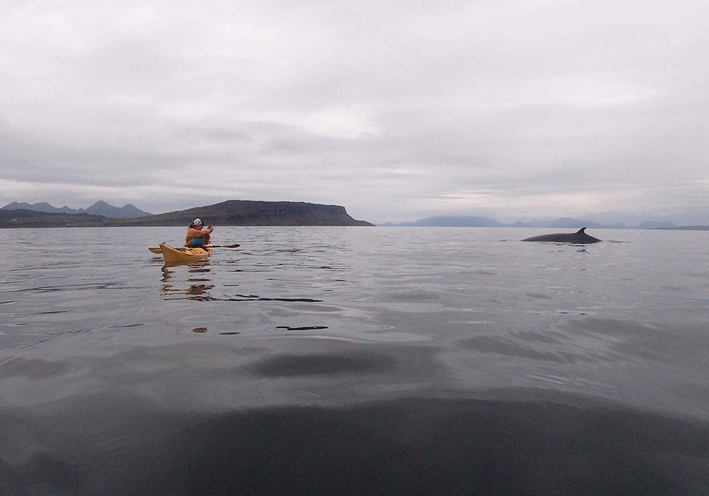 On a recent sea kayaking expedition, nearing the point of Ardnamurchan (a peninsula in the Scottish Highlands), a large flock of gannets and shearwaters was enjoying a bait ball of fish beneath the surface. Among the barrage of birds, a fin and back appeared, rolling smoothly and then disappearing.