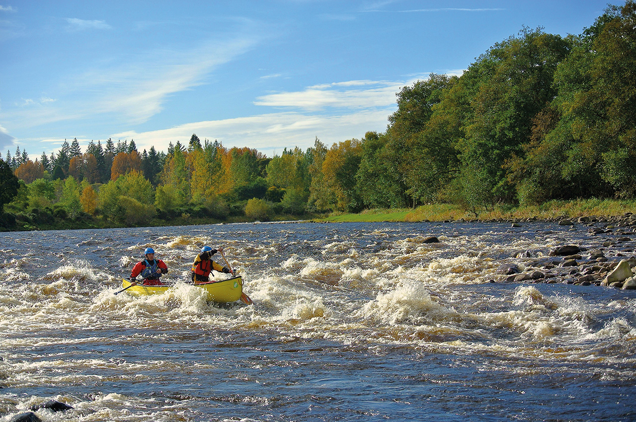 The Spey has a large catchment area with waters draining from the Cairngorms national park and plateau, and therefore has reasonable water levels for most of the year. At higher levels some of the bigger rapids wash out a bit but over-hanging trees can also present a greater hazard. At low levels protruding rocks make for a more technical paddle and the upper stretches near Newtonmore can be more bony.