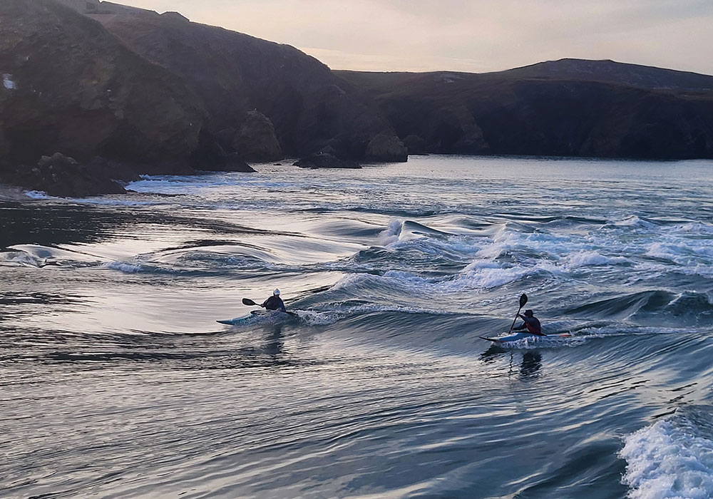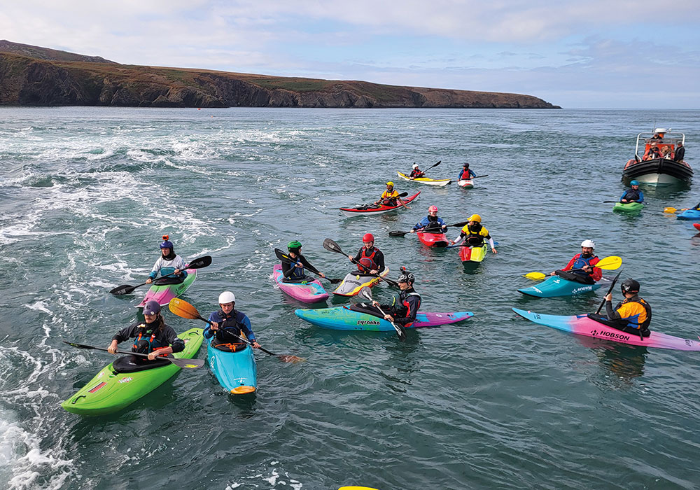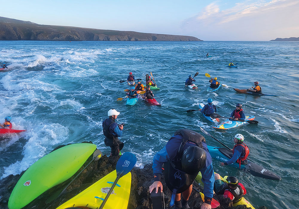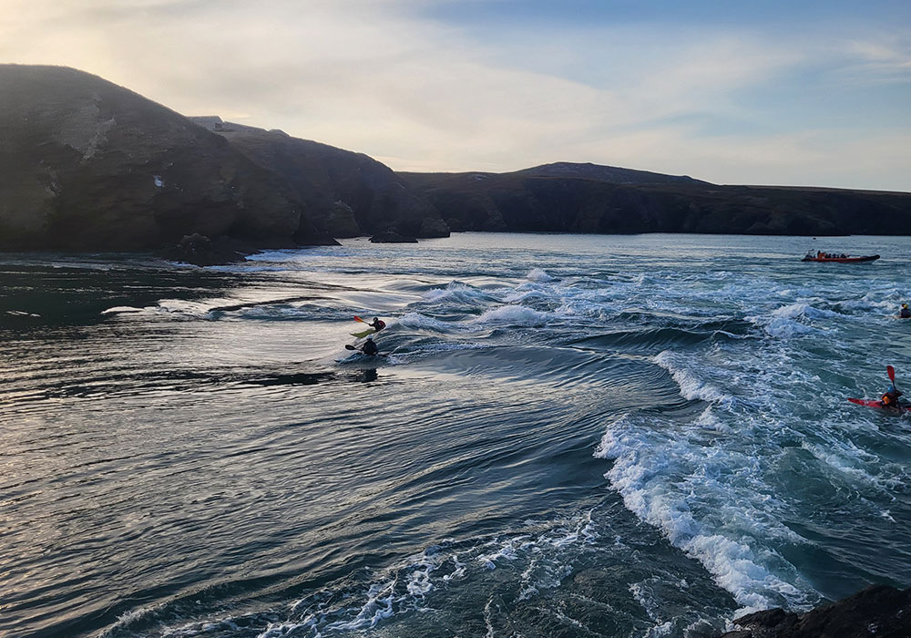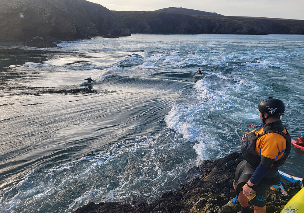 The Bitches is a series of world-class tidal rapids that attracts paddlers from around the globe. It is a magical place, but also an environment that is very different to one most white water paddlers are used to. To get to the Bitches, you must paddle out from the Lifeboat Station at St Justinian. This involves paddling up the eddy and then ferry gliding over to the rocks where the wave forms. You can read more about it in the Bitches entry on the UK Rivers Guide Book website.
