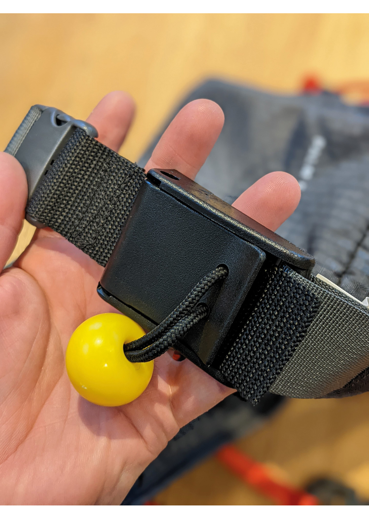 What else has changed from the previous rescue belt Palm offered? The secondary release system/loop has gone, and instead, there are loops to fasten a range of add on extras from Palm. Such as a cargo pouch (used on this review) ideal for carrying essentials on the water (note this isn’t waterproof so would need to be lined if wanting to carry first aid kit bit would be ideal if you carry one of those little phone cases. The cargo pouch measures (w)100mm X (h)150mm X (d)60mm. Looking at the loops, there is plenty of room to add other extras to this; however, I would likely prefer not to carry the pouch as I like to keep a clean belt, but this is my personal preference. The actual grab toggle is bright yellow and slightly larger than most sup belts quick release toggle and more like a PFD quick-release toggle, making it easier to grab and use.