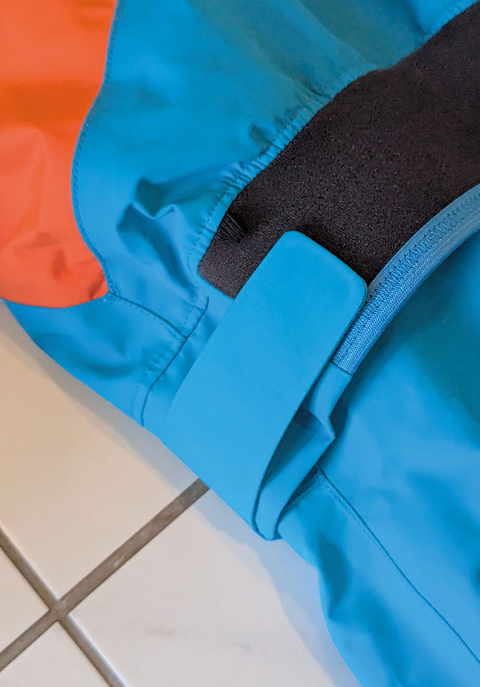 There are no pockets in the suit, so it is pretty streamlined. There is a waist baffle for the spray deck, and an adjustable waistband to tighten and keep water out.