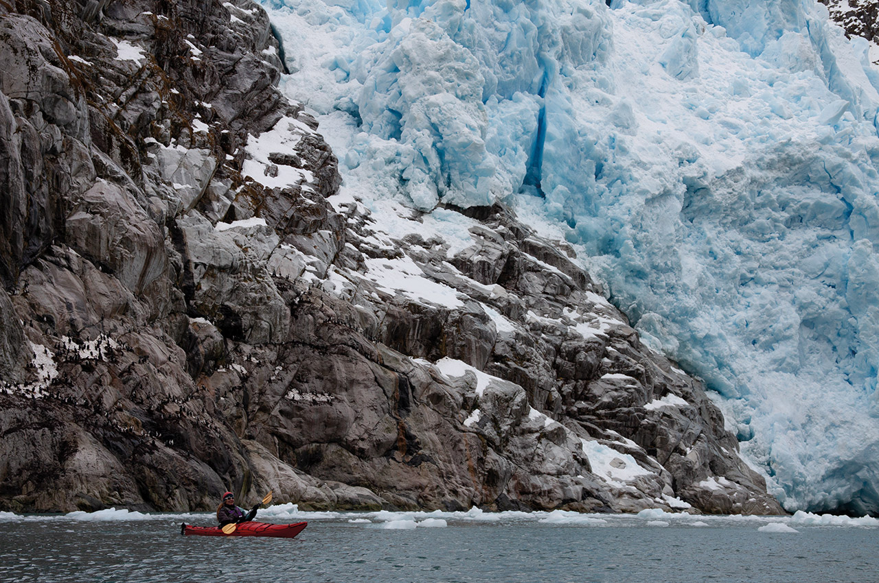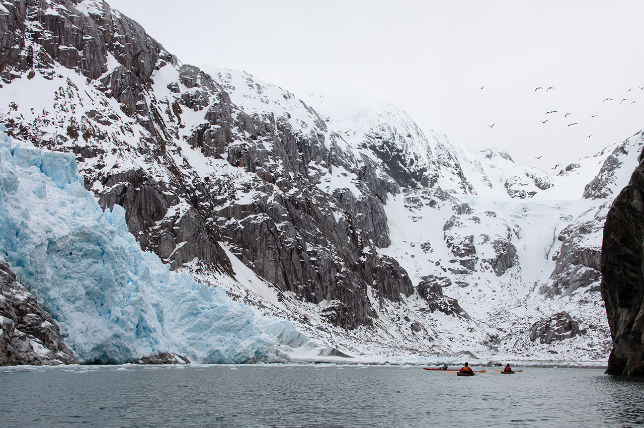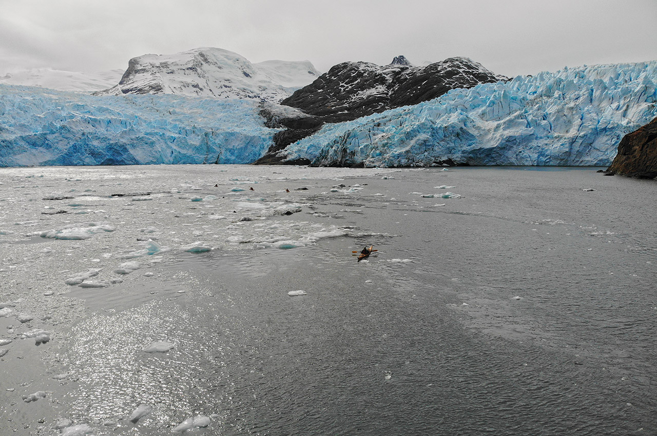 We paddled on, penetrating deep into the forks of the aptly (if unimaginatively) named Caleta Horquilla (Forked Creek). A few small chunks of ice appeared, drifting lazily on the outgoing tide, and as we rounded the point we saw the source: a gorgeous two-colour glacier, sweeping into the sea from a saddle between double peaks. As it reached the water, a rocky bluff stood in its path, forcing the glacier to flow around it.
