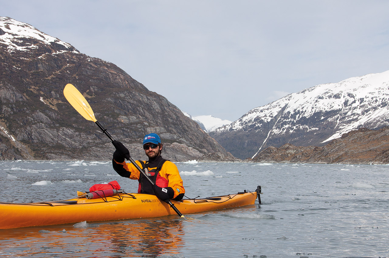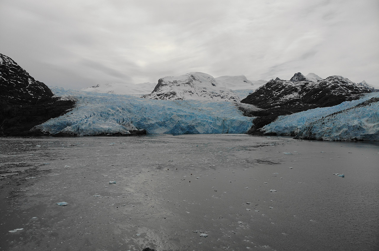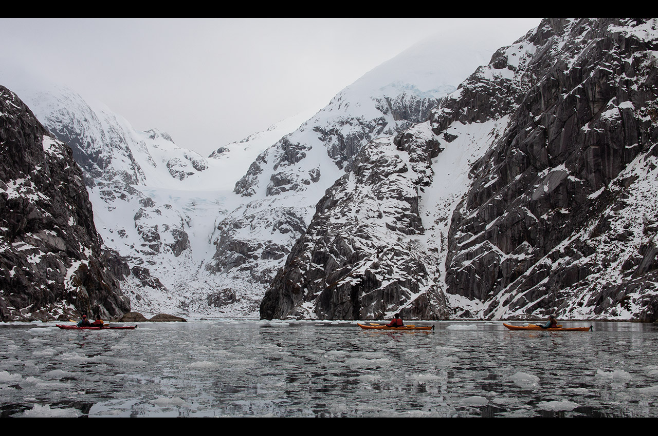 We paddled on, penetrating deep into the forks of the aptly (if unimaginatively) named Caleta Horquilla (Forked Creek). A few small chunks of ice appeared, drifting lazily on the outgoing tide, and as we rounded the point we saw the source: a gorgeous two-colour glacier, sweeping into the sea from a saddle between double peaks. As it reached the water, a rocky bluff stood in its path, forcing the glacier to flow around it.