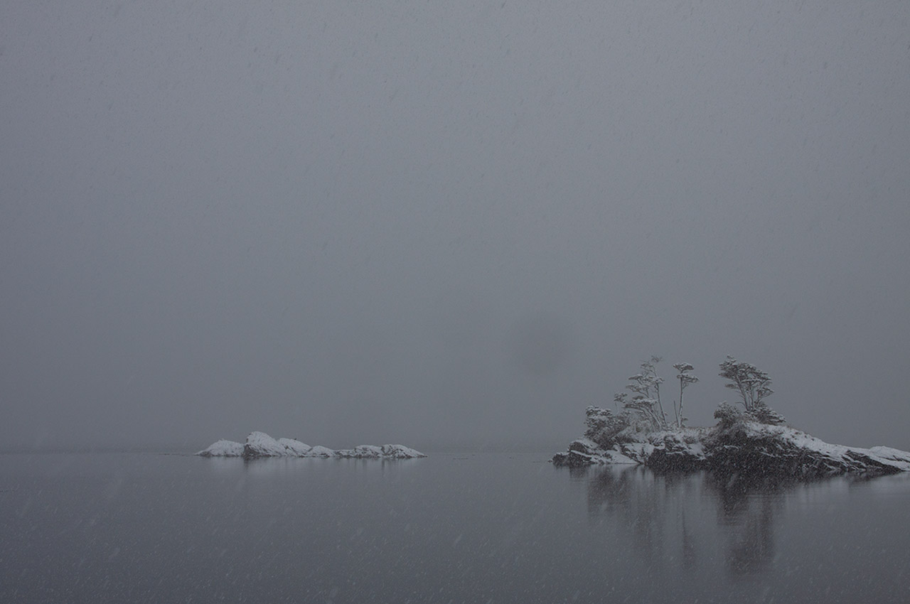 The next day dawned still and overcast, with a thick blanket of cloud obscuring the peaks which crowded the skyline all around. The driving snow overnight had monochromed the scenery – deep water, black rocks, grey sky, all rimed white with fresh snow. The wind had dropped, and the landscape reflected in the dark mirror of the water like a Japanese ink drawing.