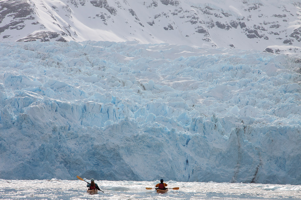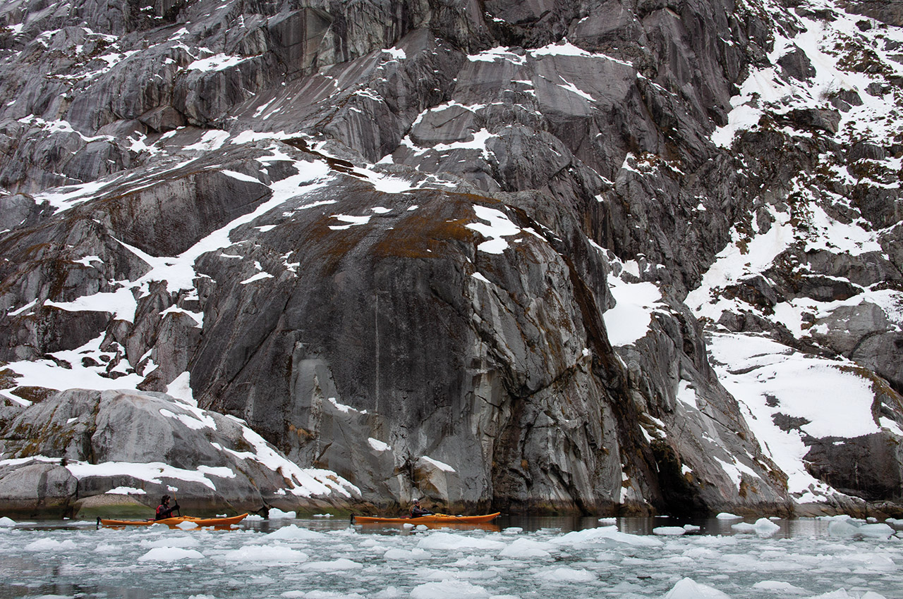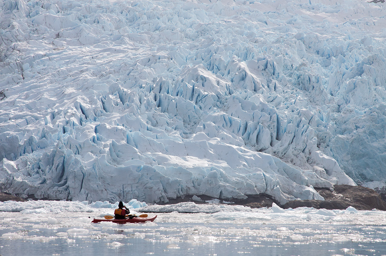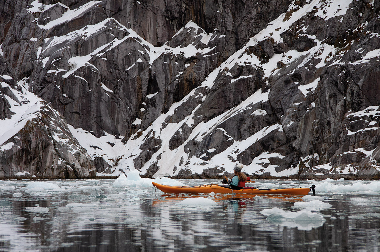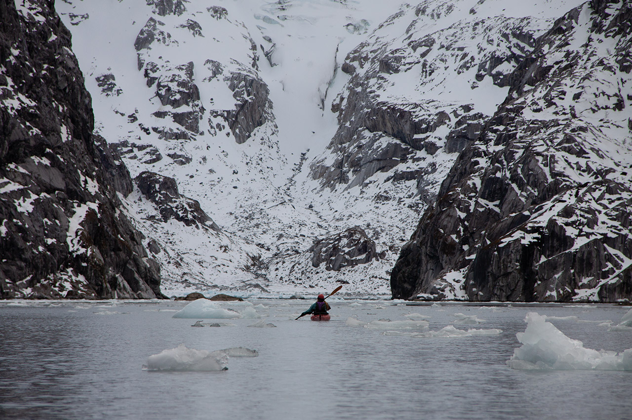 It seemed on paper like a perfect objective for a half-day paddle – around twelve kilometres there and back. And so it proved. As we paddled, mid-size chunks of glacier floated past us in stately procession. The water was a deep turquoise under the sky, still enough to reflect the cliffs stretching above. Gushing waterfalls plunged down them, smashing on rocks in clouds of spray. At the head of the valley, a majestic ice-blue glacier groaned and creaked as the sun began to warm it.