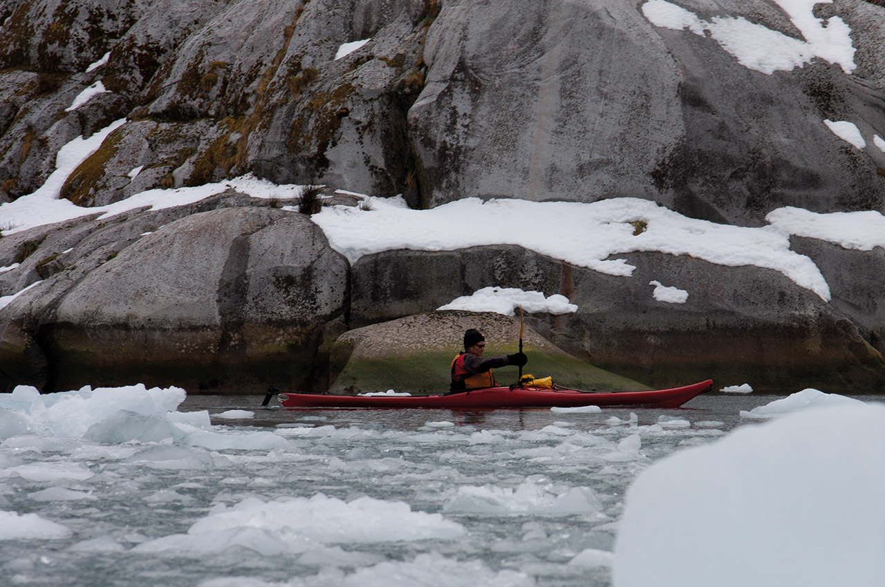 The ice, which had been a loose brash through which we’d paddled without issue, bunched together and compressed into a solid pack as it was forced through a constriction in the channel. Forward progress was impossible, and even getting a paddle in the water required multiple attempts. A capsize would have been a disaster. We rafted together, shivering as the wind pushed us, embedded in the ice pack, out towards more-open water. Once through the constriction, the ice loosened and we broke free, surfing down the sudden short chop with a 30-knot wind on our tails, back to the welcome shelter of the Icebird.