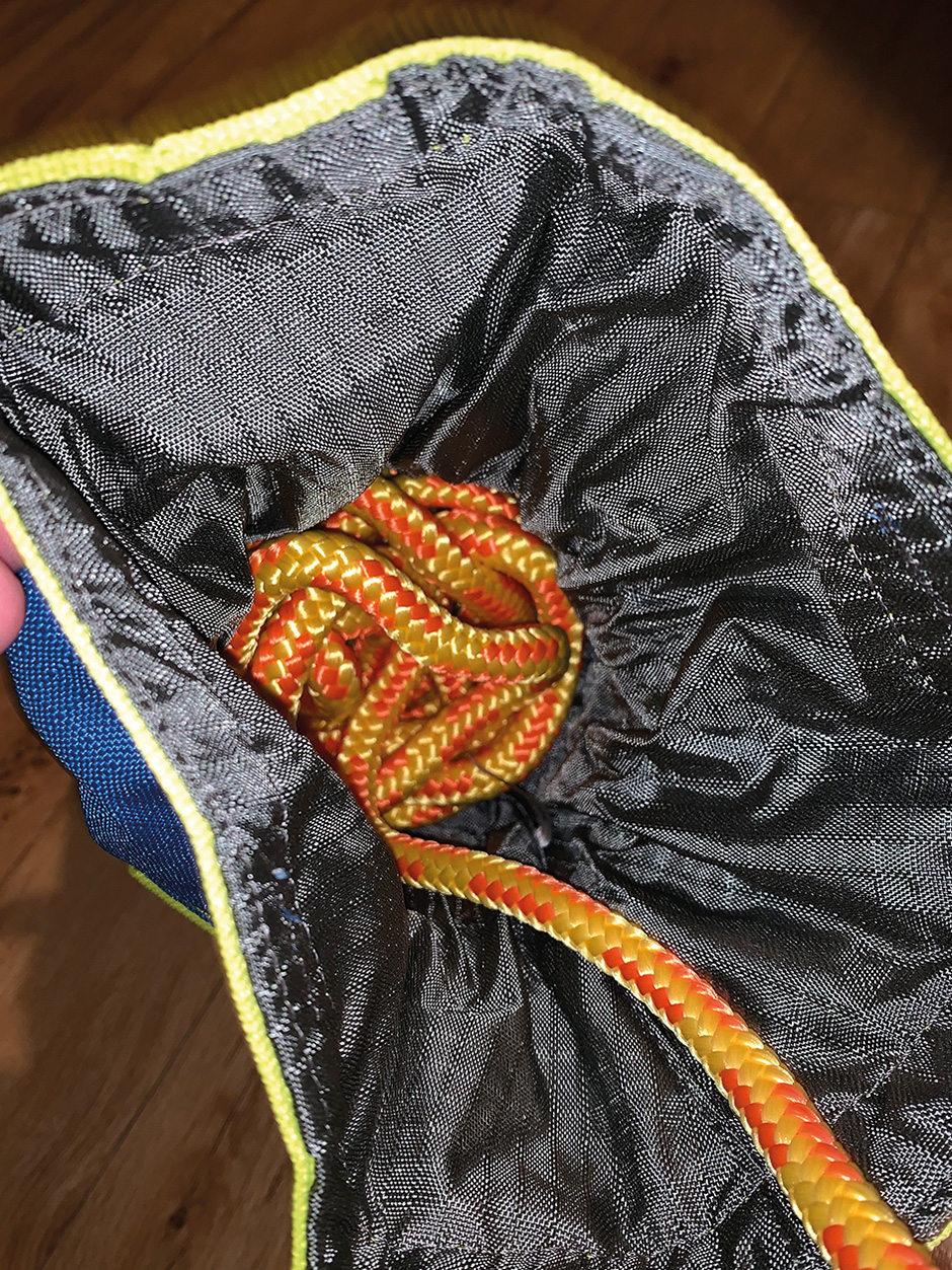 I found the bag easy to throw both under and over arm. The rope is easy to repack if you do need (or have time) to have a second go or are simply putting it away. The construction of the top of the bag is very similar to that used in a climbing chalk bag so the wide opening stays open and is very easy to do back up using the cam buckle and long length of tape.