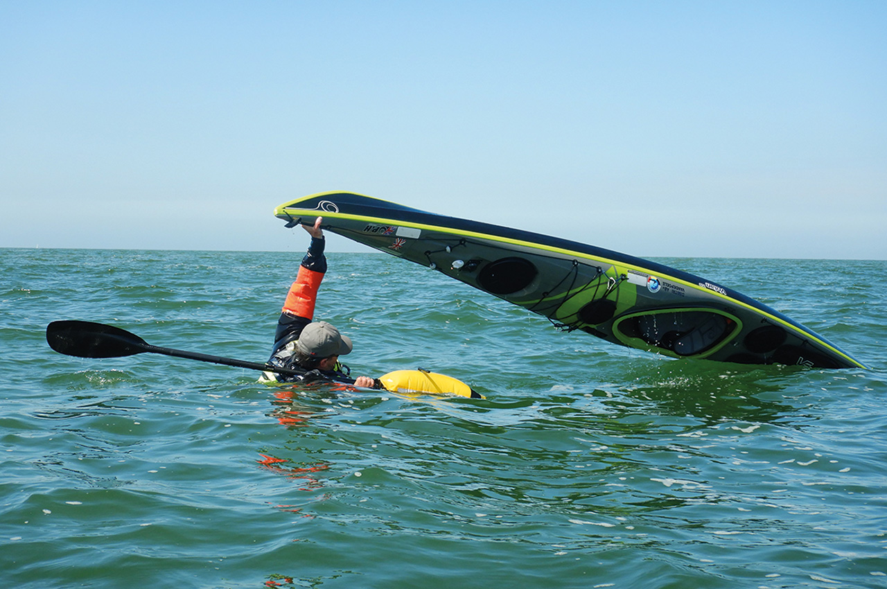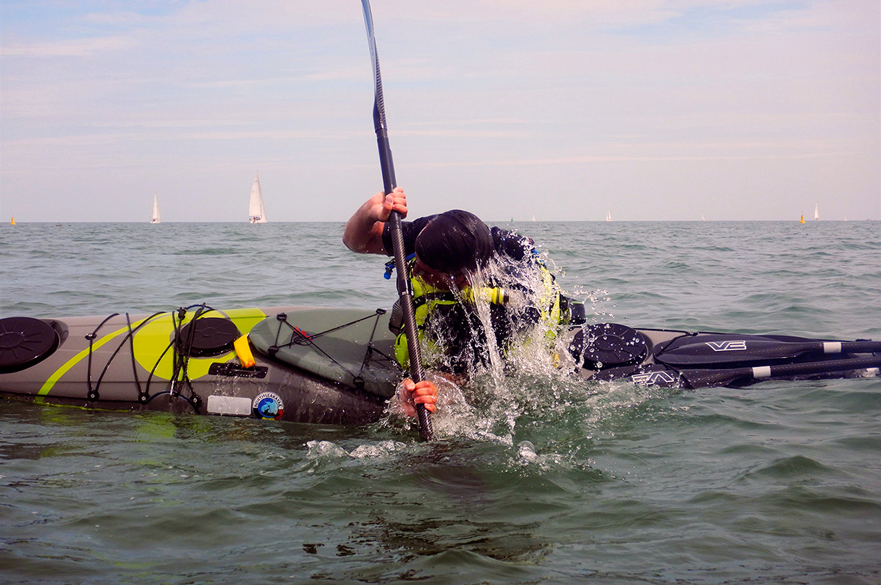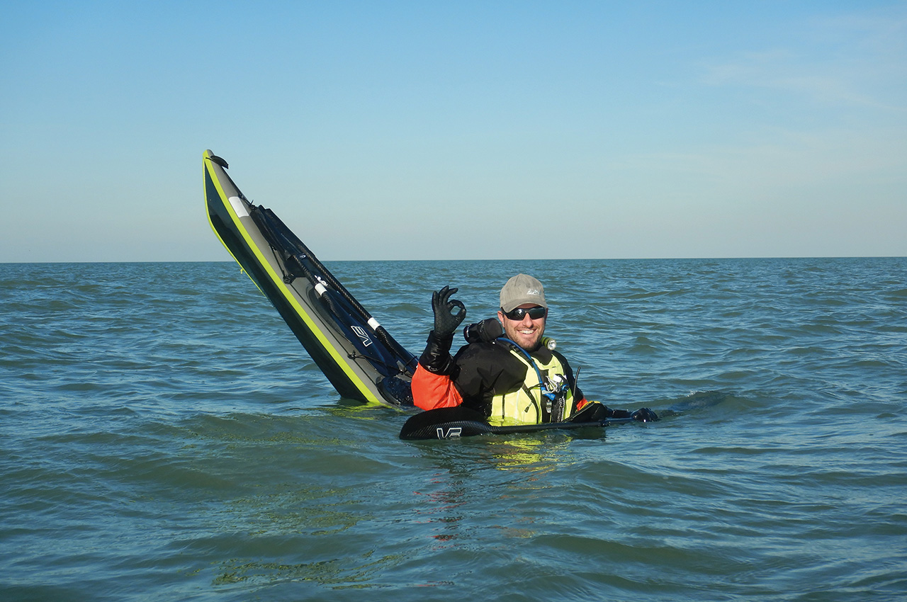 Let’s start with deep water rescues! We let the boat sink from the first day! My team members couldn’t stop laughing! “You just got the boat, and you’re already looking how to break or lose it!” So, the Cleopatra’s needle rescue (where the boat partially sinks due to a lost or broken hatch) went well. It’s also an effective way to see if the compartments are sealed properly. The boat is light to handle, when lifting the bow from the water during a self-rescue. Same counts for an assisted rescue, and easy handling during rescues due to its lower weight and shorter length. Good stability is an advantage during self-rescues in rougher conditions.
