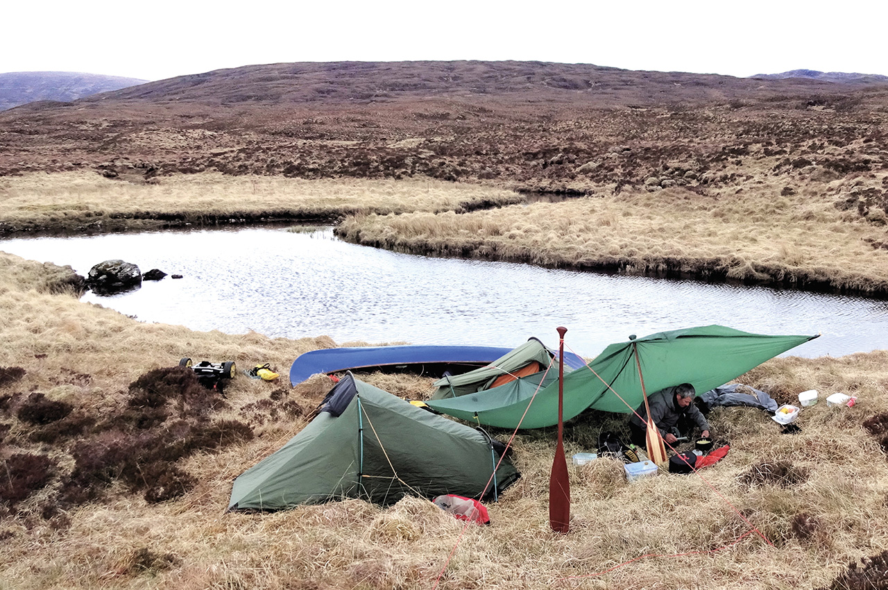 We continued until our cut-off camping time of 18:00 hours. It was going to be a night out on the open moor, so we began the search for a flat area for the tents amidst the tussocks and bogs. Tussocks are the bane of the wild camper, but I try to lessen their malignant aura by thinking of them by their pretty Canadian indigenous name – ladies’ heads. The best we could do was a rather marginal situation, but things seemed more cheerful once the camp was set up; at least we had our little oasis of comfort in this rather large expanse of nothingness. The night was dark and starless; the only sound was the chatter of the stream and the whisper of the wind. The tarp almost seemed to be breathing as it gracefully billowed, straining gently on the paddles staked out in front. The very ground seemed to radiate a deep sense of being far from the beaten track, in uncharted territory, a delicious feeling not found on every canoe route.
