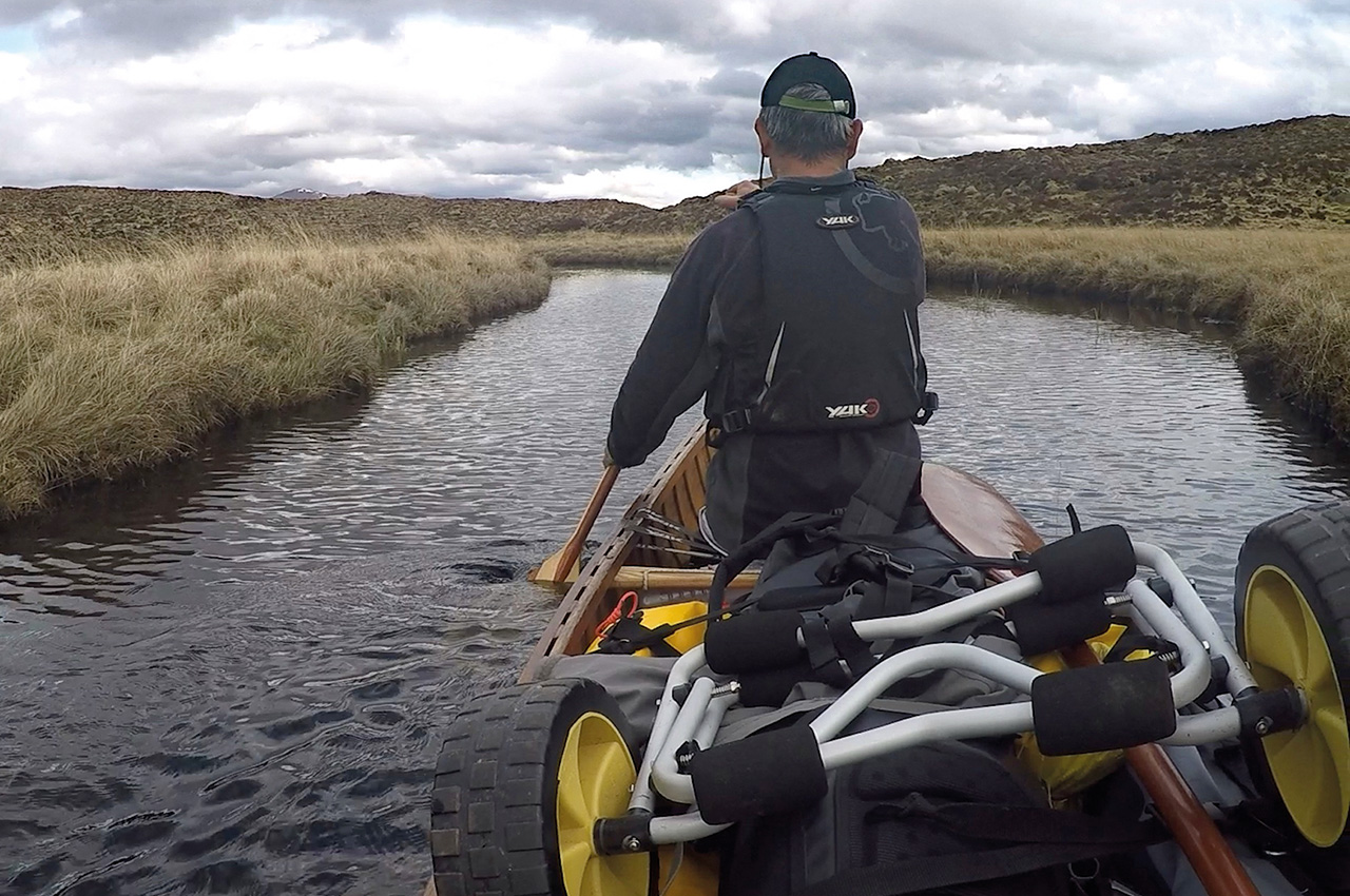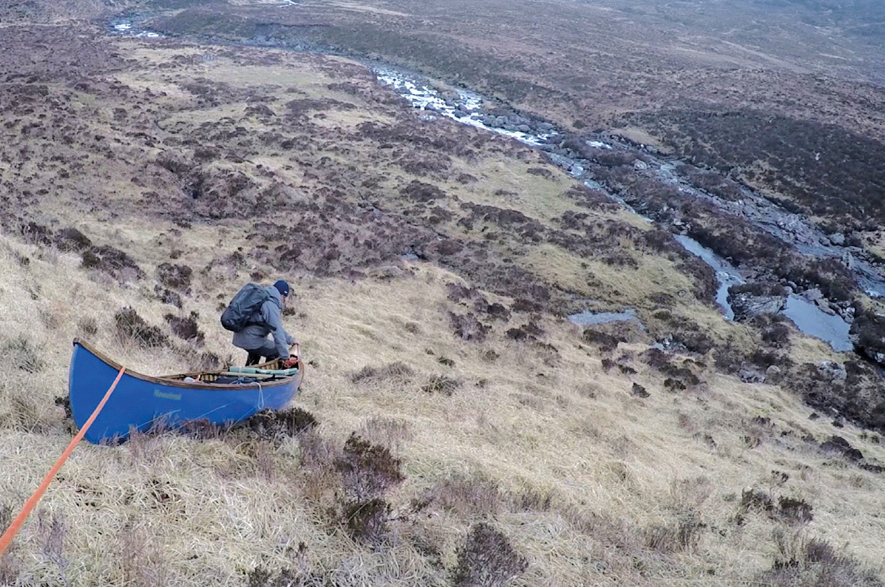 The next day, we continued portaging, wading and paddling through this stripped-down world of just two components: stream and moor. One thing I like about these trips is the feeling that the route isn’t going to yield without a certain amount of effort and ingenuity on our part. The way ahead is a bit like a puzzle that needs solving. An awkward drop was overcome by lowering the canoe down a steep bank on a line.