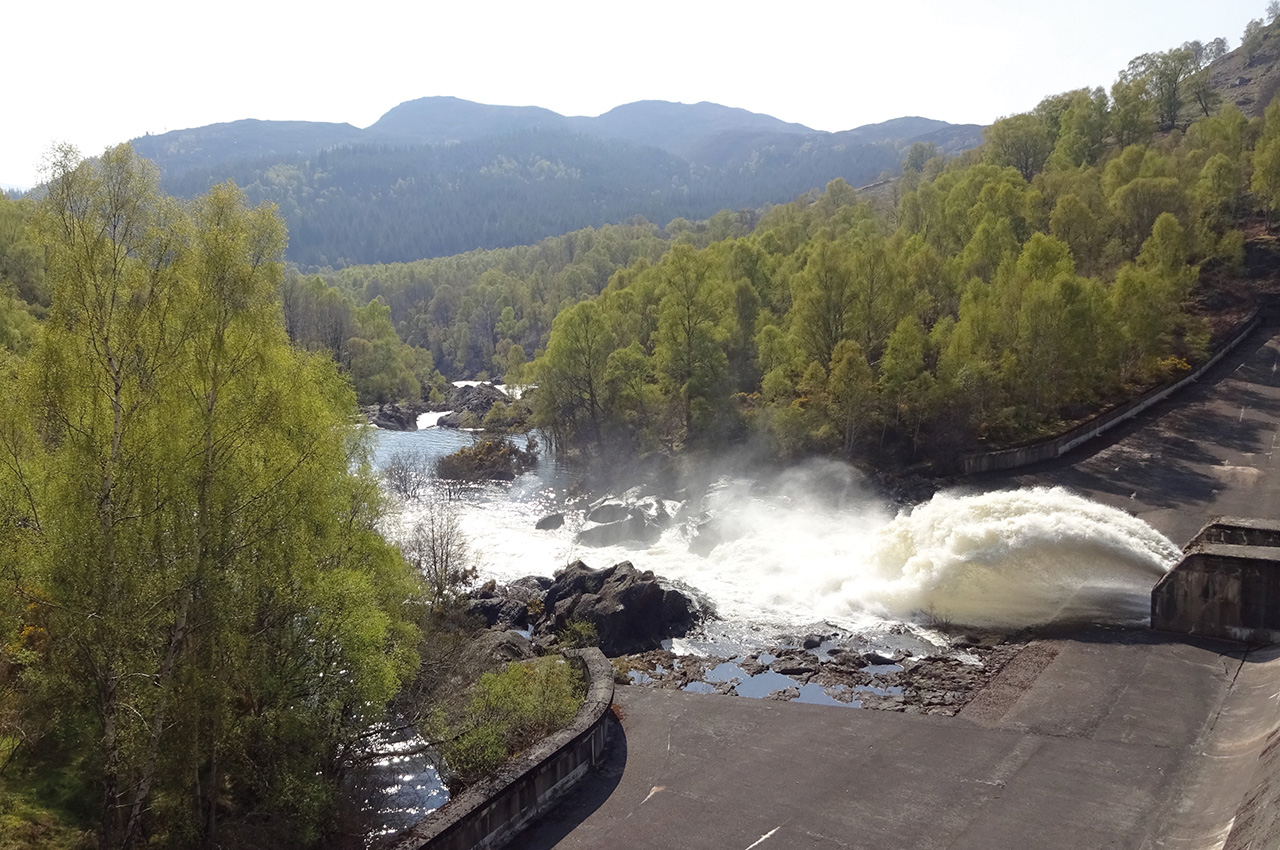 Beyond the dam at the southern end of the loch, a huge jet of water arced out into a spectacular rocky gorge. Portage time.