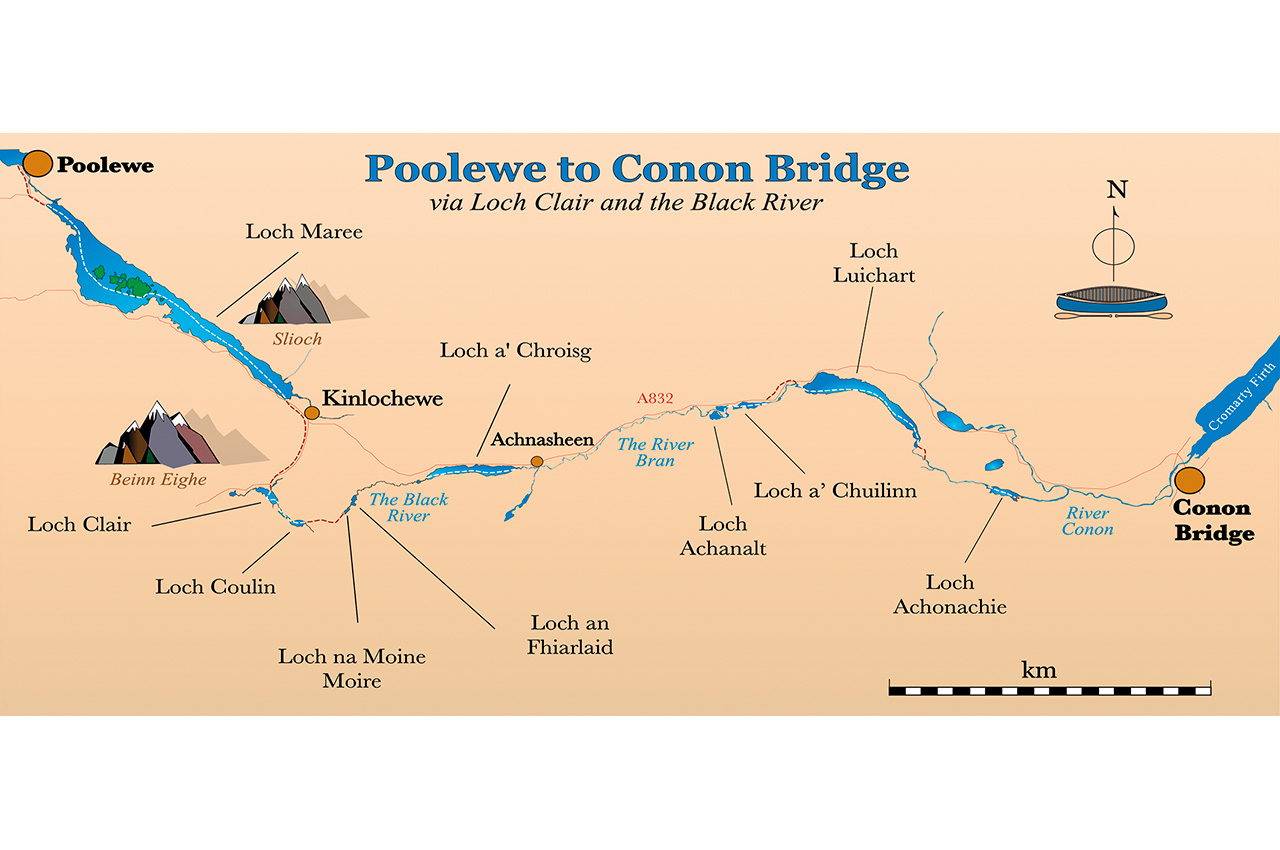 The 2005 Scottish Canoe Touring guide somewhat inadvertently elevated the Poolewe-to-Conon Bridge route to the stuff of legend. The guide told of how paddlers got wind of the route via an obscure note on the wall of a bothy. Some seem to have doubted the route’s existence. How exciting. The route seems to be rarely paddled, presumably because people are put off by the thought of rolling a trolley seven miles up the steep, narrow and busy A832.