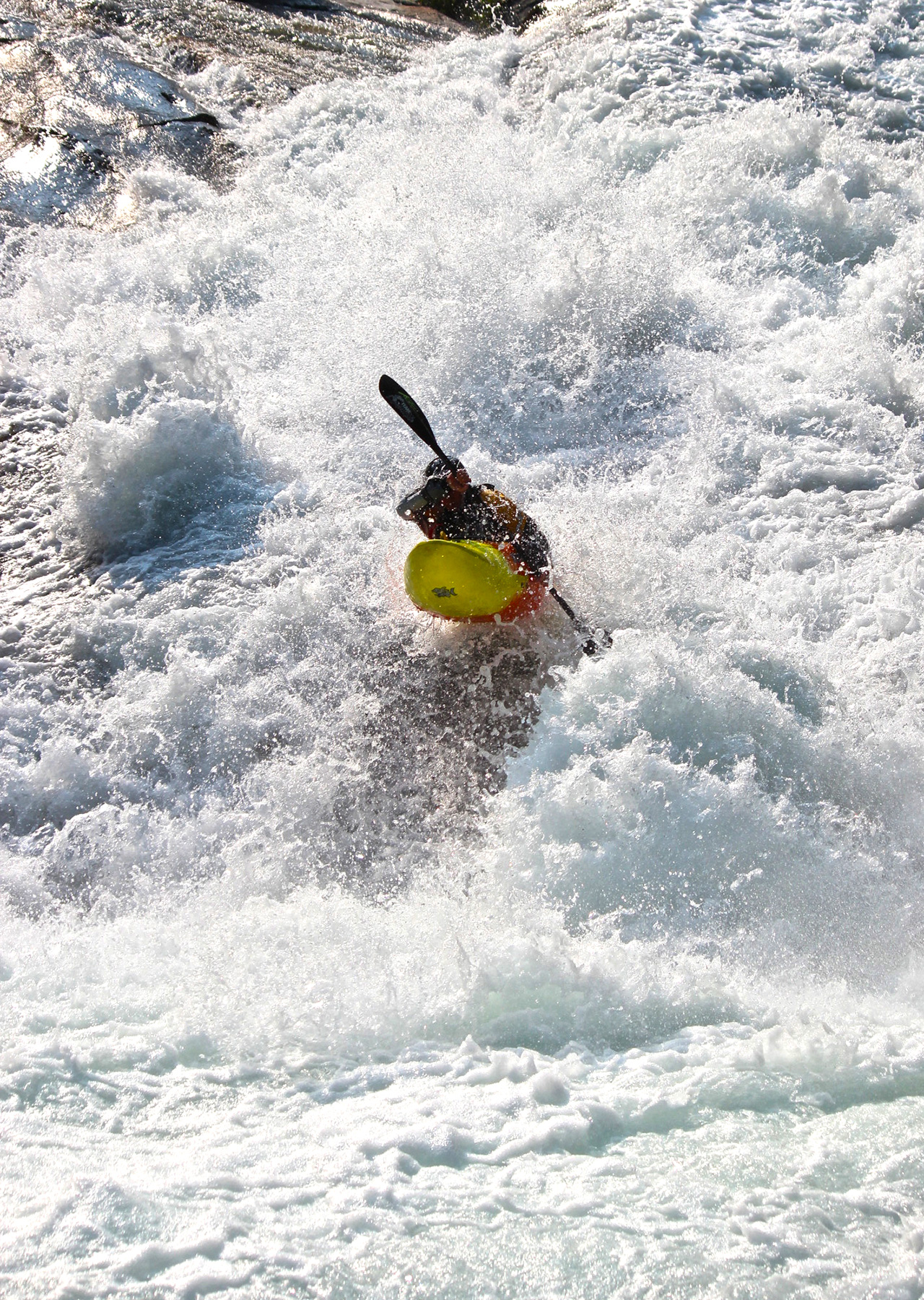 Flemming put-in first above the lead-in rapid for nine. He floated down an almost class 6 sequence then re-positioned for the lip. The line was almost perfect, Flemming dropped in just above the kicker but hit it slightly off causing him to spin around resulting in a heavy landing, ripping him from his kayak. Luckily, he was OK.