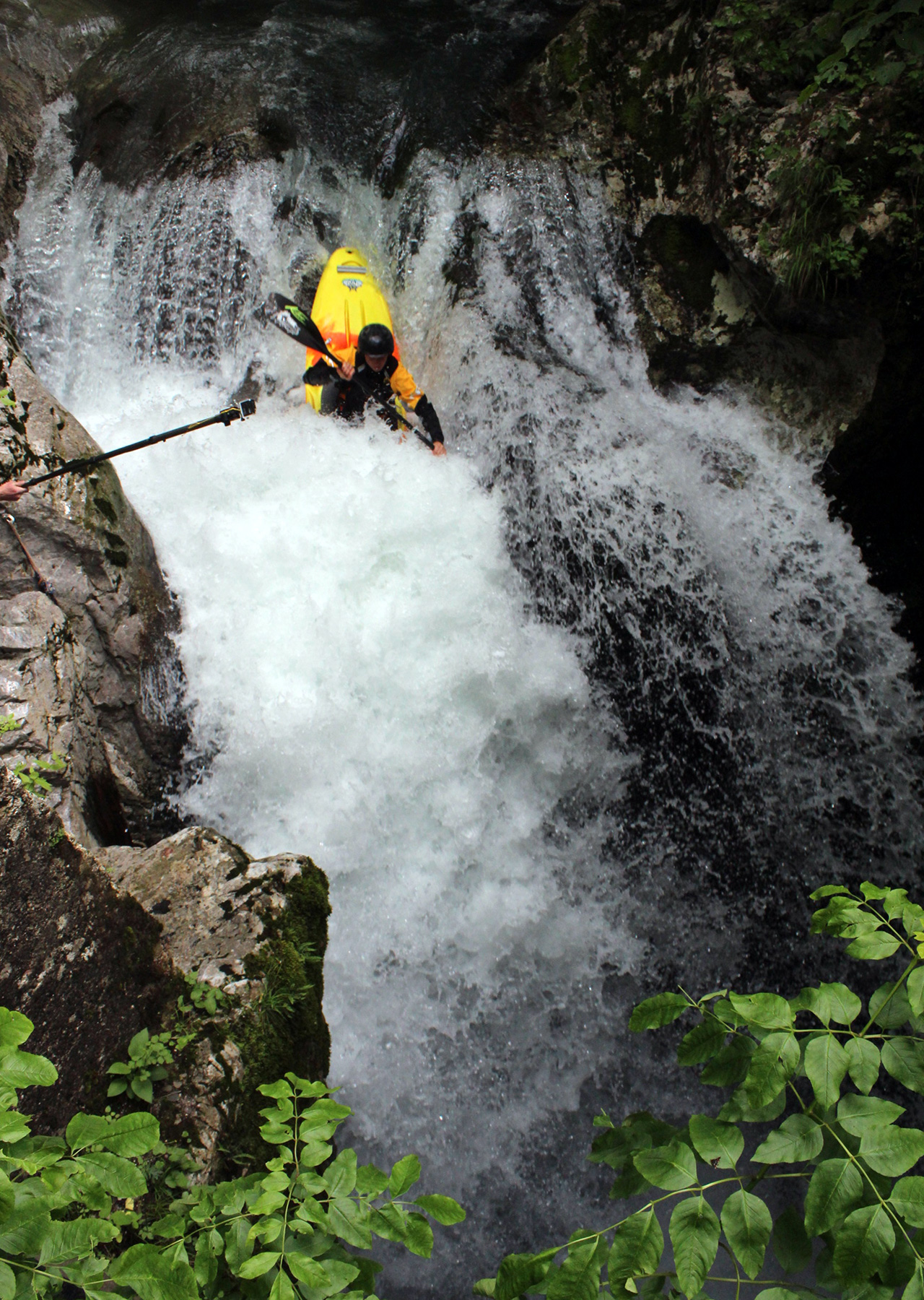 The party was pretty much rained off but everyone had a great event. We had some time before leaving so we checked out the Kozak waterfalls. We decided to give the second drop a go, never been paddled before, looked sweet with all the rain they had been having. Our first D of the trip, a sweet 50-footer into a tight canyon open at either end. After the drop you can paddle out to the confluence to the Soca.