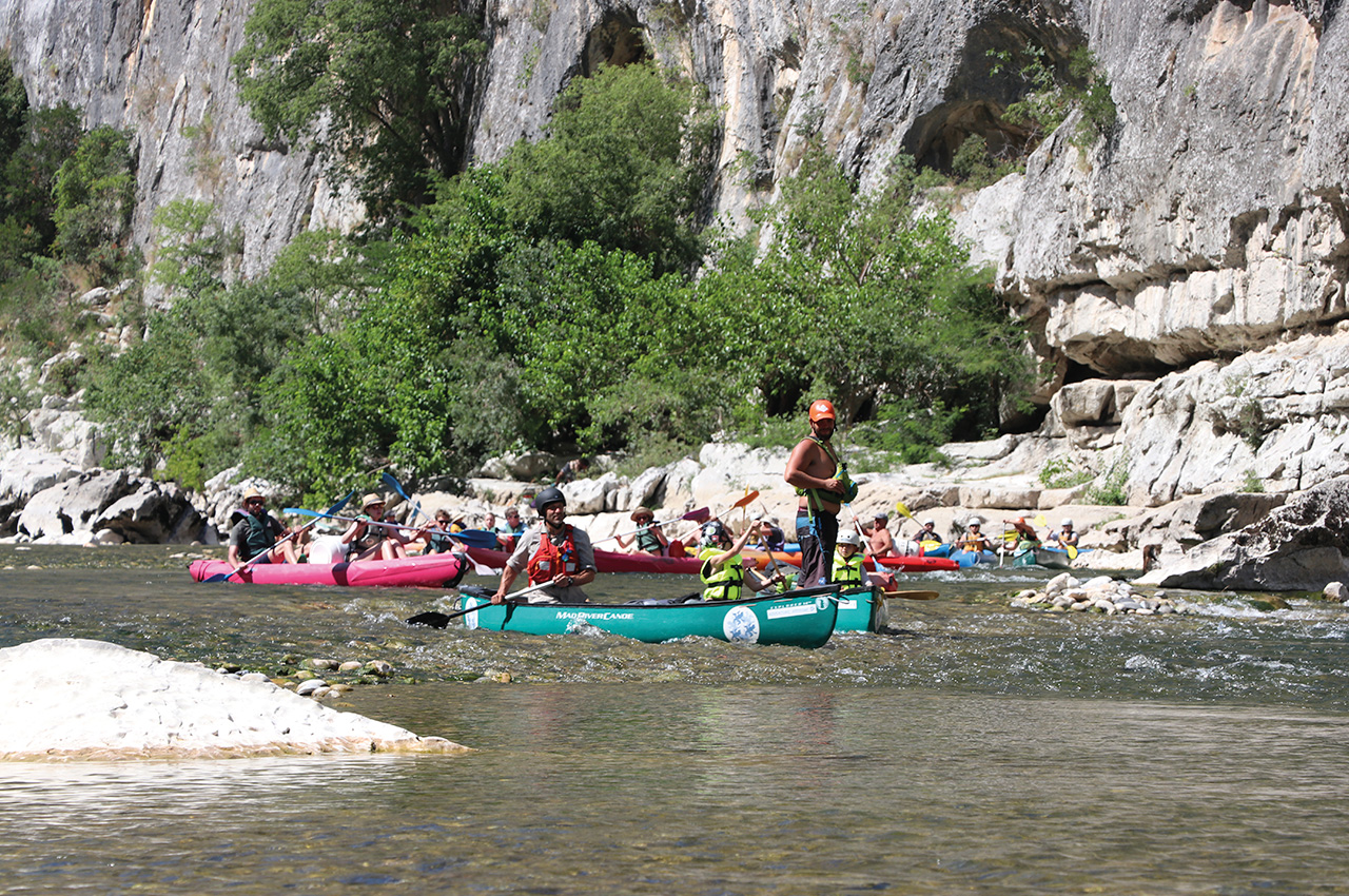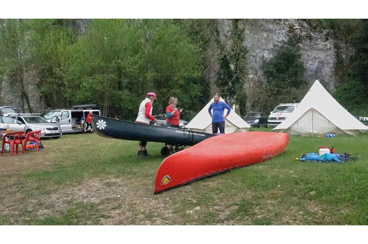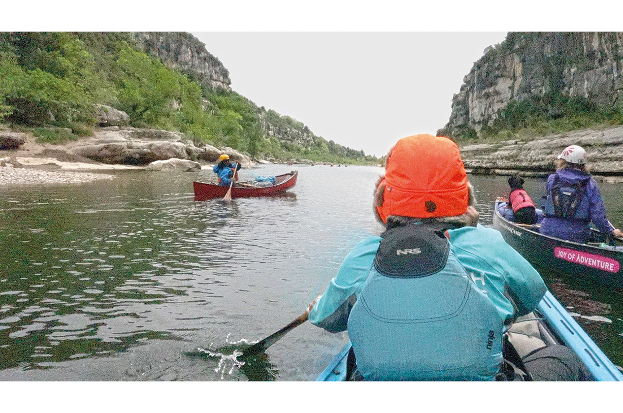 This time we started from the Adventure Ardeche campsite, the last camping on the river right before the cliffs close in and you lose the road. One of their bosses, Iain, had sorted camping tickets for an overnight at the bivouac site in the gorge and arranged a pick-up at the end. This is a great spot just below the town of Vallon Pont d’Arc. A breakfast of fresh croissants and a buttered baguette set us up for the day. We were seven in number; Lina, Joy and Noddy were solos, Sharon and Rod tandem, and Maya and me.