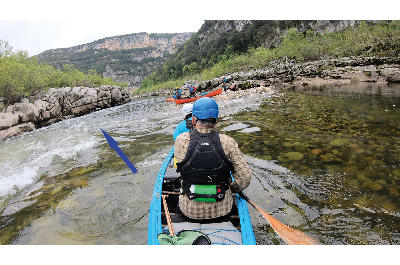The river bends right, and if you stay right and point right (red arrow), all is easy enough. But if you continue to point left, a small rock creates a small partial eddy below it (blue arrow). Photo Black Tooth 2.