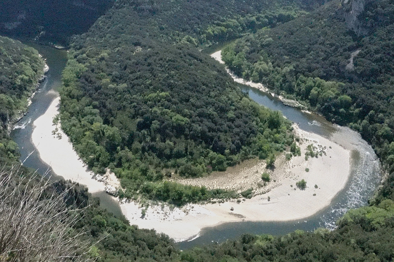 Then to the magnificent Pont d’Arc. The river used to flow around a channel to the left, looping around the base of the limestone ridge. Over millennia, the river cut into and eventually through the ridge’s base, carving out the magnificent arch. We paused to explore the caves at its base before moving on.