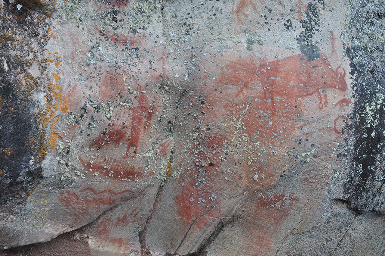 An early start allowed us to make the excursion to the pictograph site at the eastern end of Artery. Typically they were positioned on a steep rock wall overlooking the water. For the natives it seemed to mark an important junction between various worlds. Amongst other things they show a shaman with a radiating power line coming from the head and holding an otter pelt medicine bag. Below the shaman is a well-manned canoe.