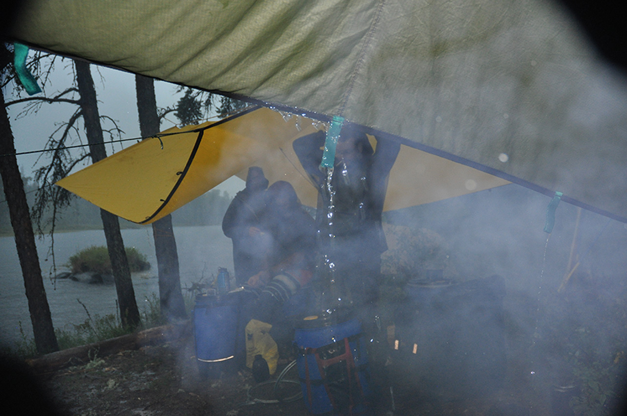 This trip had started in a heat wave and become increasingly hot and humid, it was brewing up a storm. On the day it became obvious as we set up camp with tents and tarps. As usual we cooked on a wood fire and as we ate, it became darker and the first distant cracks and rumbles started. The wind picked up and an elemental storm crashed around us.
