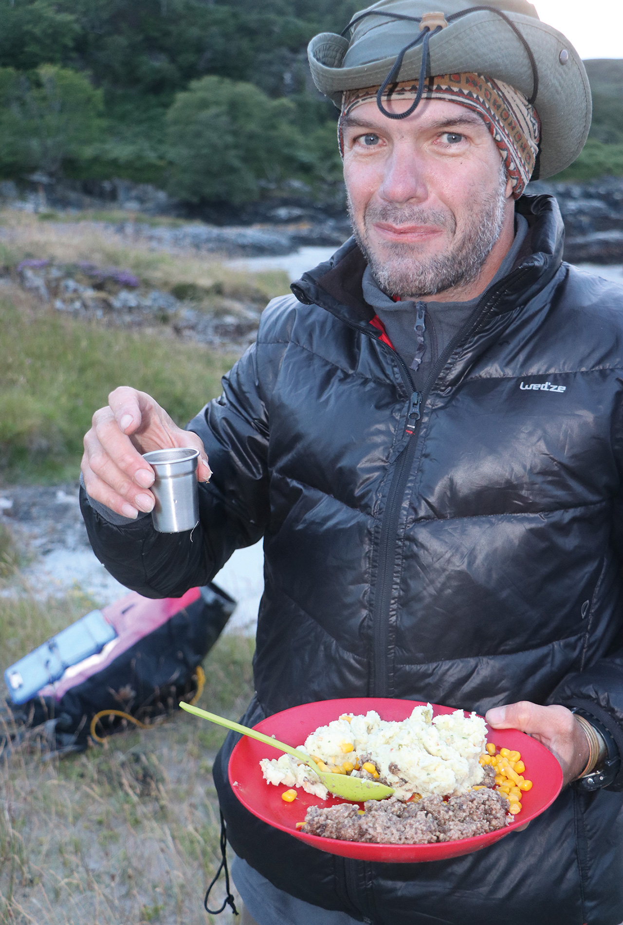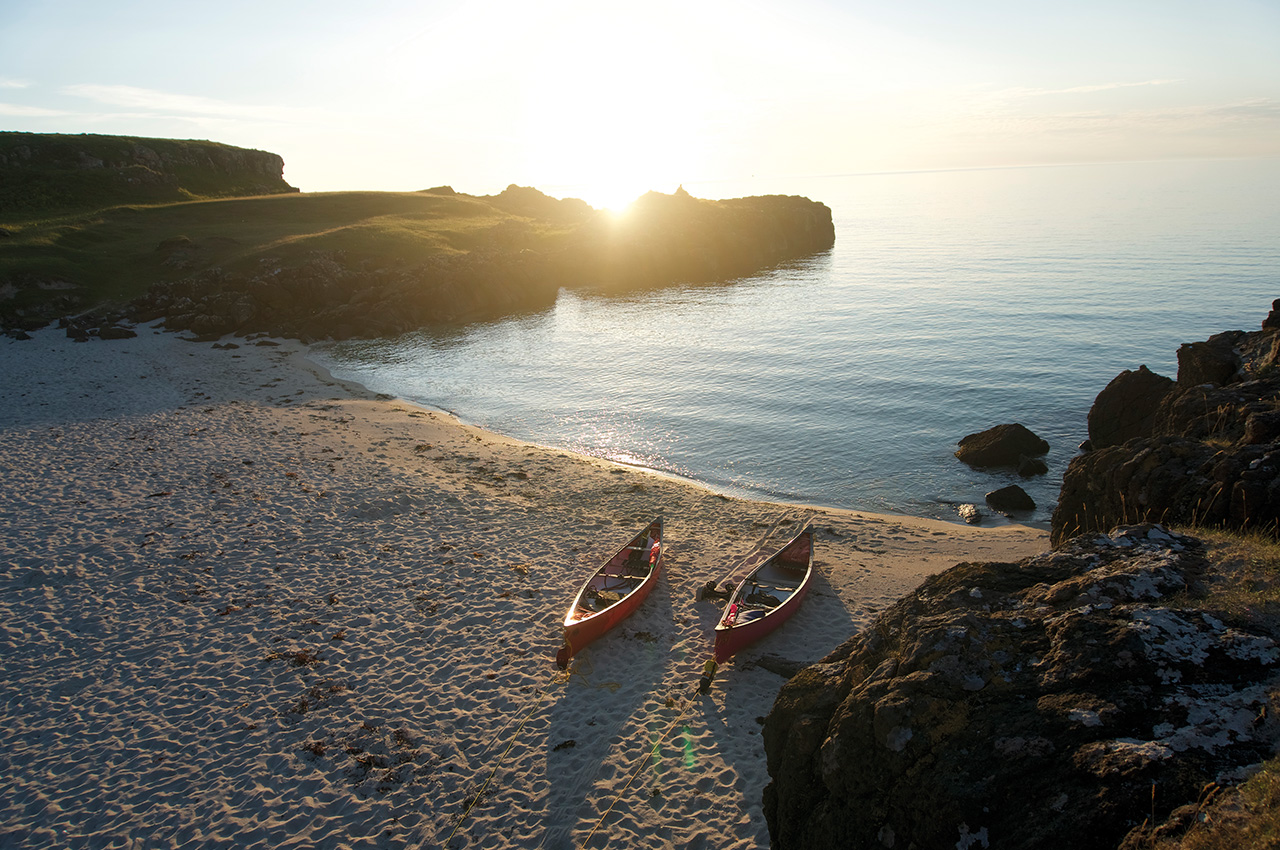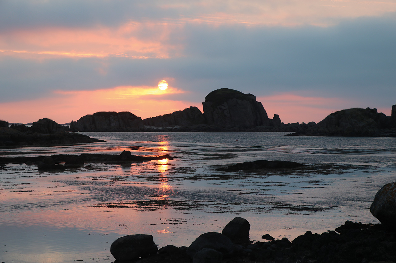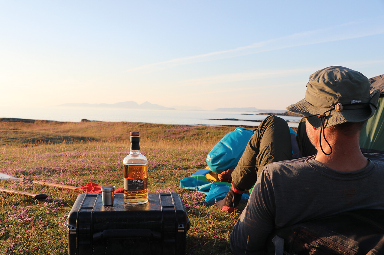 Our location looked north to Rhum and Skye and west to Coll. With a meal consumed it was time to chill out and enjoy the moment. A spectacular sunset bathed the area in an orange glow bringing out the amber in the Ledaig whisky. Having a bottle of the local malt has been part of the tradition through all my years of sea kayak guiding, it was a fitting end to the day.