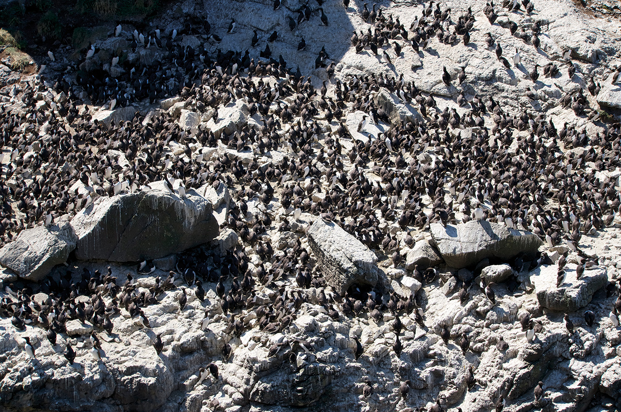Onward along a narrow path, past cormorants and a few other birds, we ended up over looking a sea stack separated from the island by a narrow cleft. A cacophony of razorbills and guillemots coated every available space. Eventually we had had our fill, photographs had been taken and we wandered back to the canoe. Originally we had planned to camp on the island but conditions were too good with the wind dying completely. We needed to take advantage of conditions and the gem of Staffa beckoned in the distance.