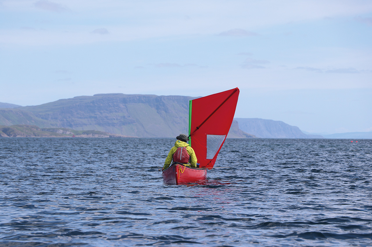 The sea took on an oily calm and we plodded along with Staffa slowly getting bigger until we could at last make out its massive basalt columns. More yachts and boats were lying off its south east corner. We paddled past the mighty Fingal’s cave and then had to make a decision. Landing and a camp beckoned but the forecast was now showing a wind increasing from the north. We could easily get stuck on Staffa in a big blow. It was onwards to the Ross of Mull as the wind started. Soon we could get the sails up and have a bit of ‘free travel’.