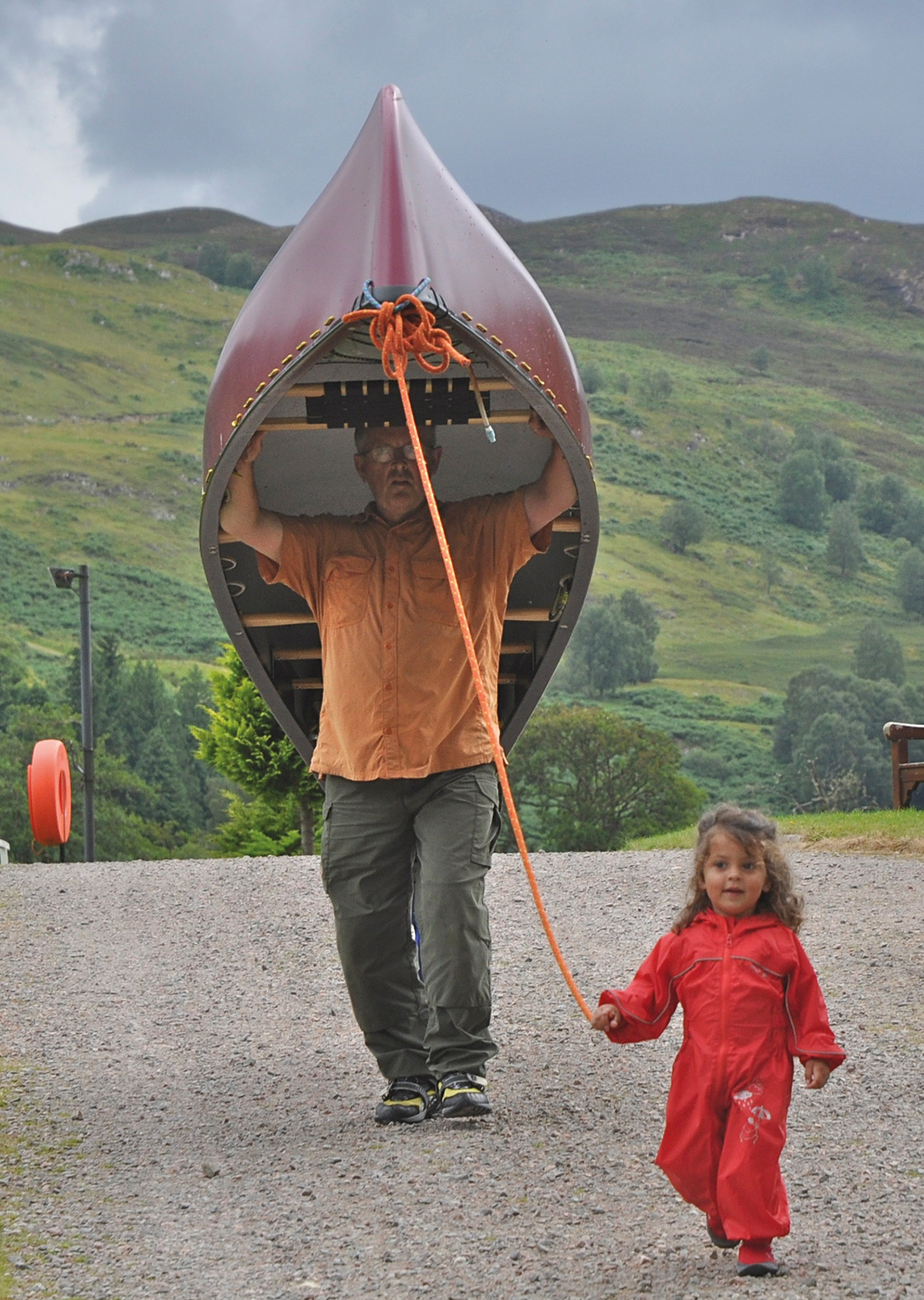 Then past the River Oich. It has one awkward rapid on a bend and another problem or two. I didn’t fancy it with no other canoe as support, so we stuck to the canal. We had two more portages around Cullochy and Kytra locks. At Kytra, when Maya was only two, I got a wonderful picture of me (below) shouldering a canoe whilst she led me along with the painter It was my way of controlling Maya and not letting her wander over to the locks’ big drops and deep water. But she was so proud and positively marched along towing me.