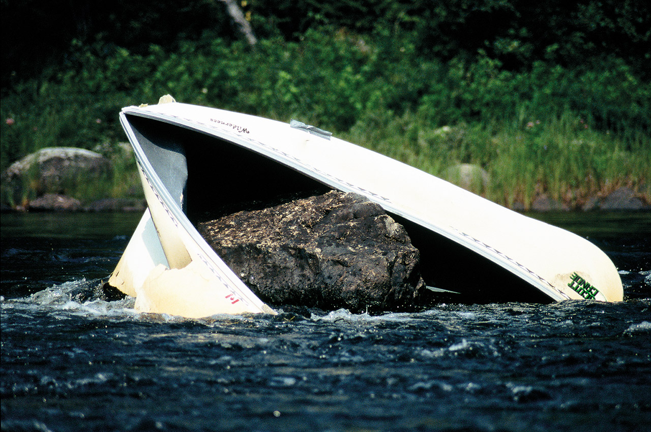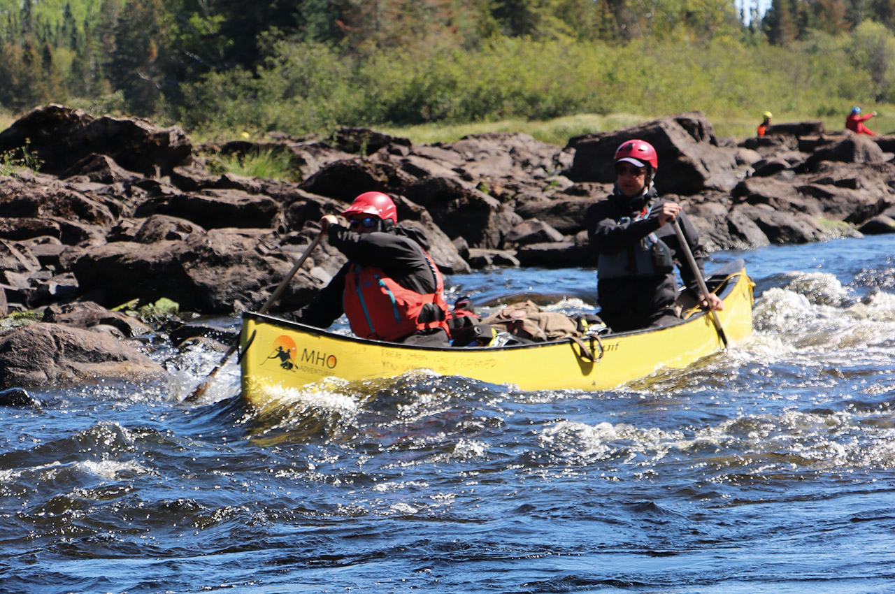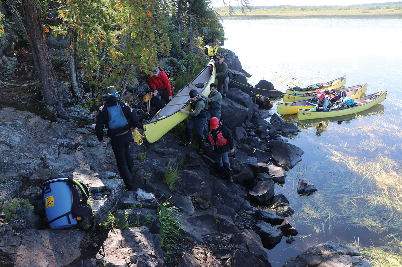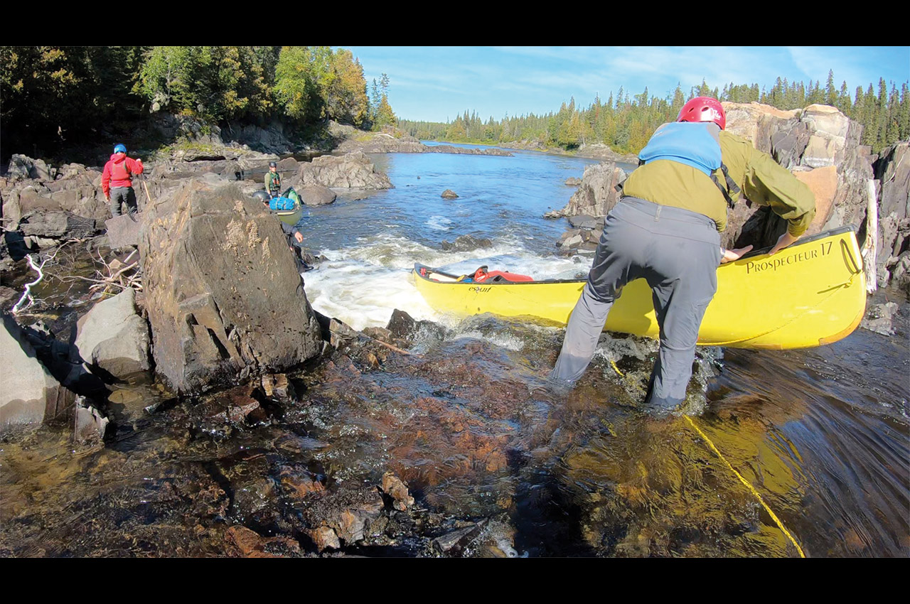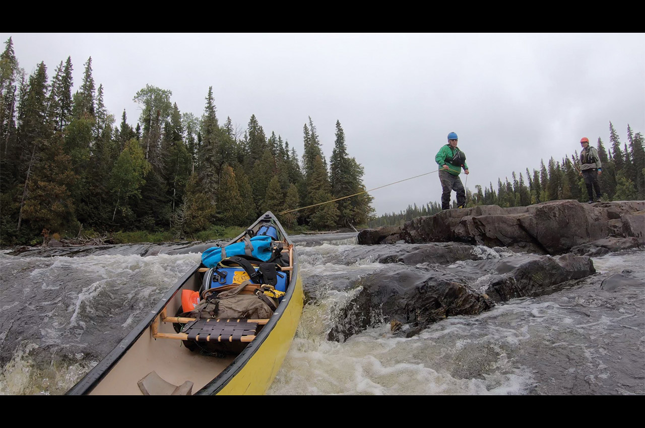 Our second day had us down to first Long and then Sun rapids. The latter with a couple of awkward rocks right in the main flow at the end of the rapid. A quick decision was made by Paul and myself and it was the whole team out to line down. As this was the first use of the ropes it took a whole lot of attention on our part both for the safety of the boats and the making sure the team moved carefully across the boulders. The caution was emphasised when we inspected a wrecked canoe from another party – indeed, within a kilometre, we came across another canoe wrapped high around a rock. These are not places to chance injury or losing a boat!