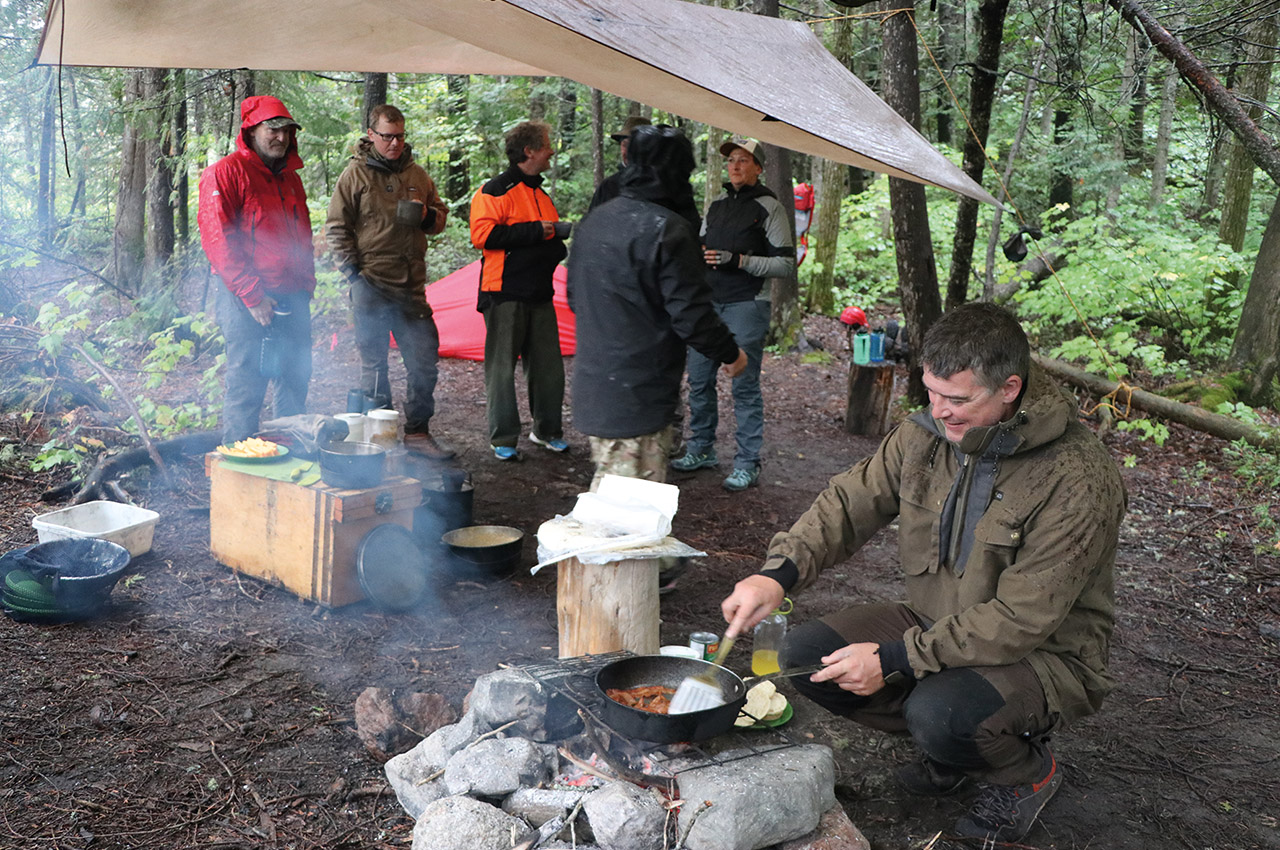 Back into the Missinaibi we headed on until late in the day and at last we reached the first possible camp, however, two teams were already camped there! One was a university course and another led by Jeff Tindall. We knew Jeff from a previous trip and had bumped into him days earlier before we headed into Brunswick. He quickly invited us to share the site and even use the tarp already set up. A quick scout starting to bring in dry wood and Paul soon had a pot boiling for a brew and then the meal was underway. We scrabbled around for flat spaces but we soon had everyone camped up.