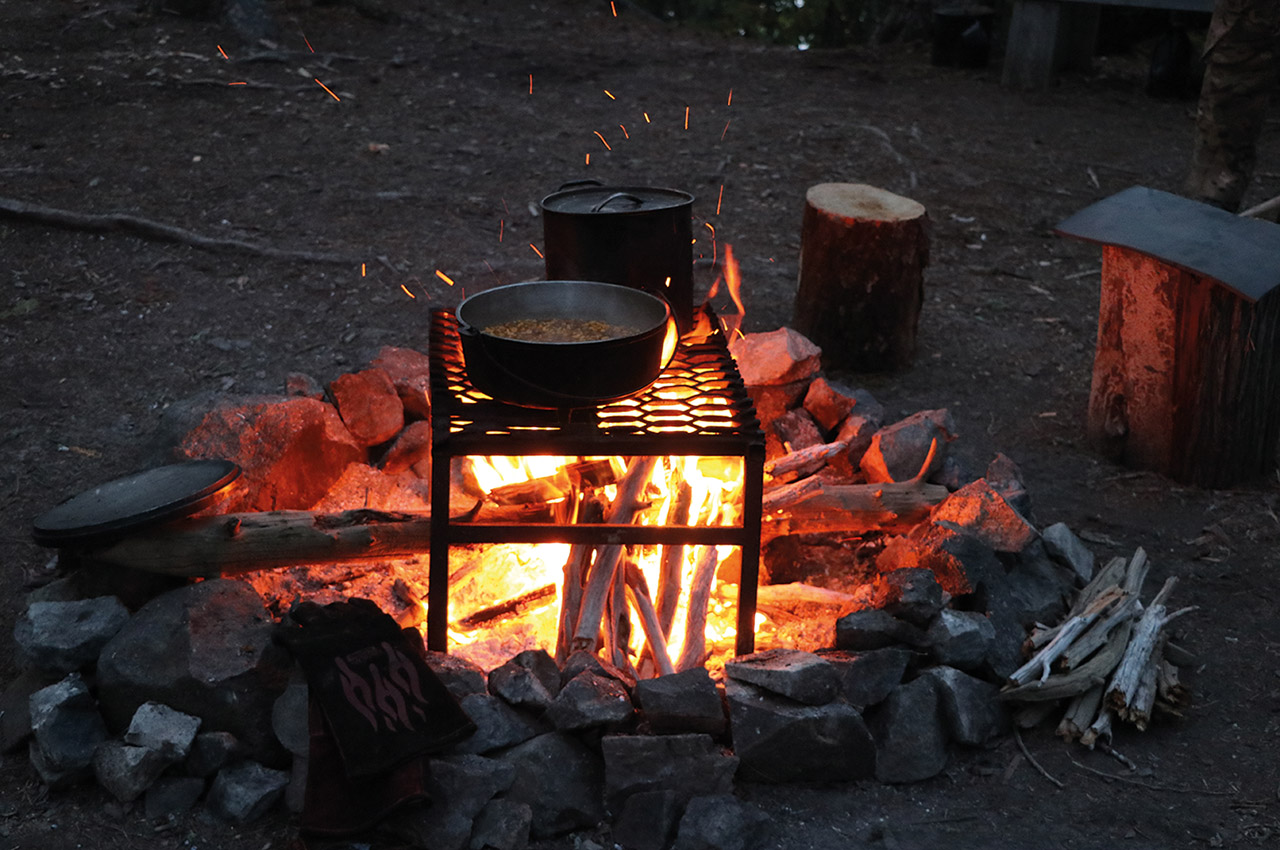 A 100-metre paddle and we were at the awkward landing at the foot of the knoll, where only one boat at a time could unload. I grabbed my pack and leaving everyone else unloading got up to the camp area. My priority was to set a group tarp up, so there would be some respite from the rain. Soon the kit was up at the top and most were off to gather whatever dry wood could be found. Paul had the fire going quickly and the first water was on for a brew. Anyone can walk into the woods on a dry day and set up but it is in the wet and wind that your skills are proven.