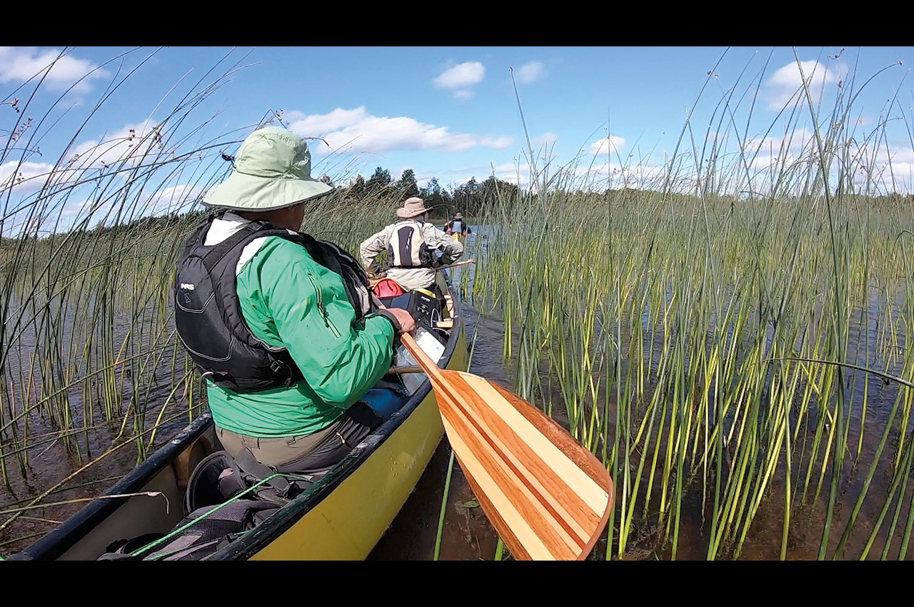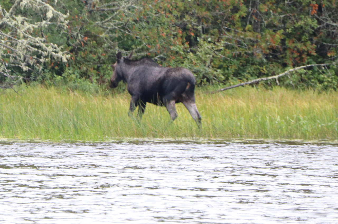 we worked shelter to shelter along the lake. On a distant shore we spotted a black bear foraging before it noticed us and calmly disappeared into the woods. We lunched at the narrows and then paddled into the end of the lake and the start of the river.
