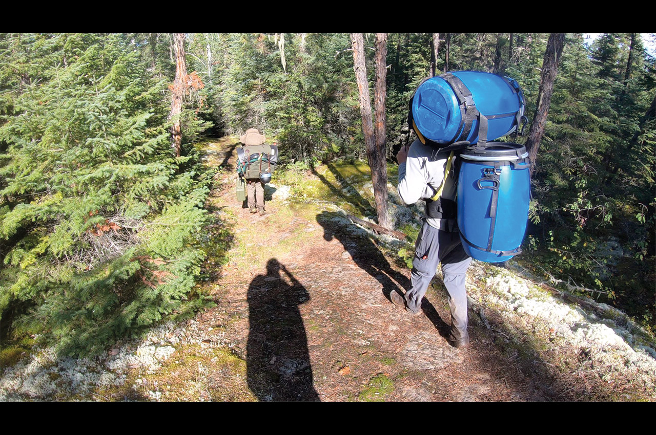We camped at the start of the portage and carried the canoes across the 1.5 km that same day. The trail is slightly overgrown with a number of fallen trees. Some had teamed up to carry in pairs and some solo. The final part of the portage is muddy and the wood dropped into it to make a dry crossing was appallingly slippery. At this point I gave up my solo carry and waited for assistance carrying the canoe by hand for the final bit.