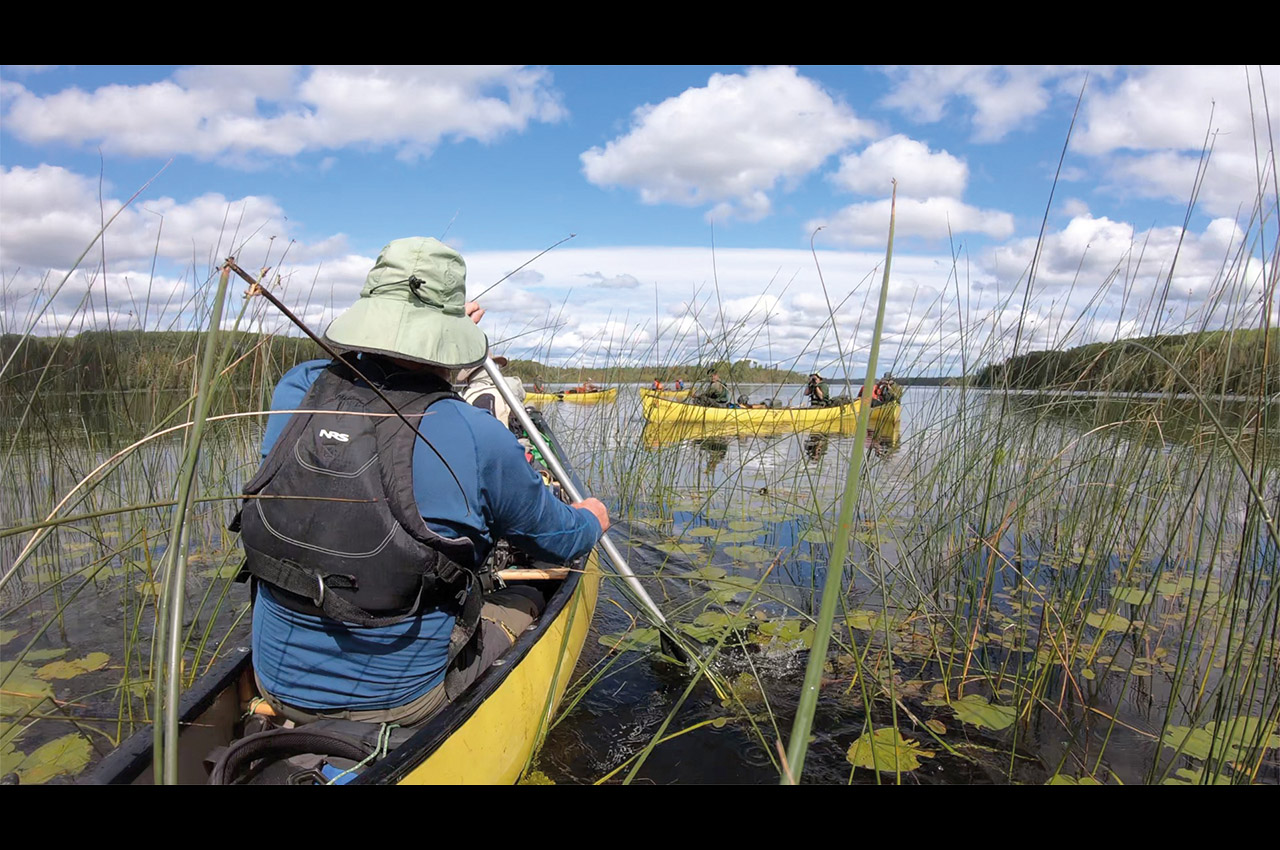 Next morning most of us did two trips carrying loads across. The launch into a branch of Brunswick Lake was shallow, muddy and lily infested. We laid a carpet of branches to enable us to push out further before resorting to punting through a long section of shallows before breaking through to the main lake.
