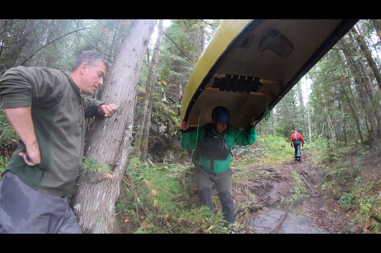 We had reached the top of Greenhill and Paul and I were in agreement that the team should portage. The river was higher and there was less experience in the group. However, I would run it solo with a loaded boat before helping with the portage of some 1,400 metres. The portage cuts across way from the river so I would be on my own. Again, I worked myself down it eddy by eddy. Sometimes running the boat aground in shallows to slow down and get a look downstream. So, with a mix of tactics I worked my way down. By the time I got to the bottom Paul had already dropped a load at the end of the trail and was on his way back up for more.