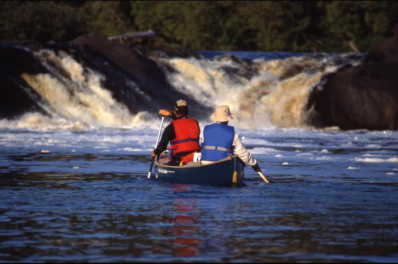 Back on my first trip in 2003, I approached this with some trepidation. Hap Wilson’s guidebook included dire warnings about this 1,400-metre rapid, “Impossible to scout… meaner than a junk-yard dog… a real canoe cemetery.” That first time I had my friend Jon as bow paddler and that led to a problem. Great to have on Jon the trip and in the wilderness, he was however inexperienced as a paddler. We started working down from eddy to eddy never leaving one until we had a definite line and a plan to get to the next.