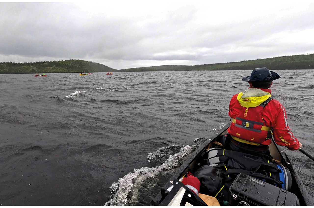 The day started windy, and we were on the shores of one of the larger lakes, Grove Lake. It was 5km from our campsite to the shelter of the inlet leading out of the lake. We loaded up, and I watched the gusts and judged their frequency. It looked doable, but Paul and I ensured everyone’s kit was well-lashed into the canoes. We would have been glad of the extra buoyancy if things had gone wrong.