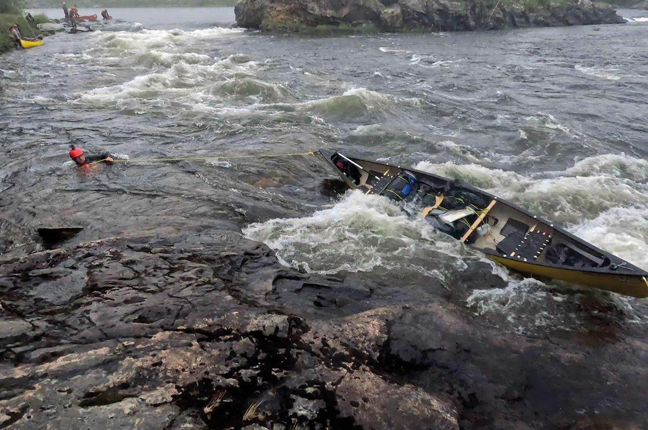 He let the upstream end turn out, and then the current immediately grabbed it and swung it out. I yelled for him to let go as I could easily let it swing in on the bow rope, something I had done hundreds of times. But David was fixated on holding the rope; his hearing had shut down. I shouted repeatedly to let go, but he kept hold, capsizing the canoe and being dragged downstream. I could do nothing with the bow rope and had to let it go. But again, David, having caused the problem, came into his own. He grabbed the bow rope, was quickly ashore, and got the boat in. He had not heard one of my shouts to let go.