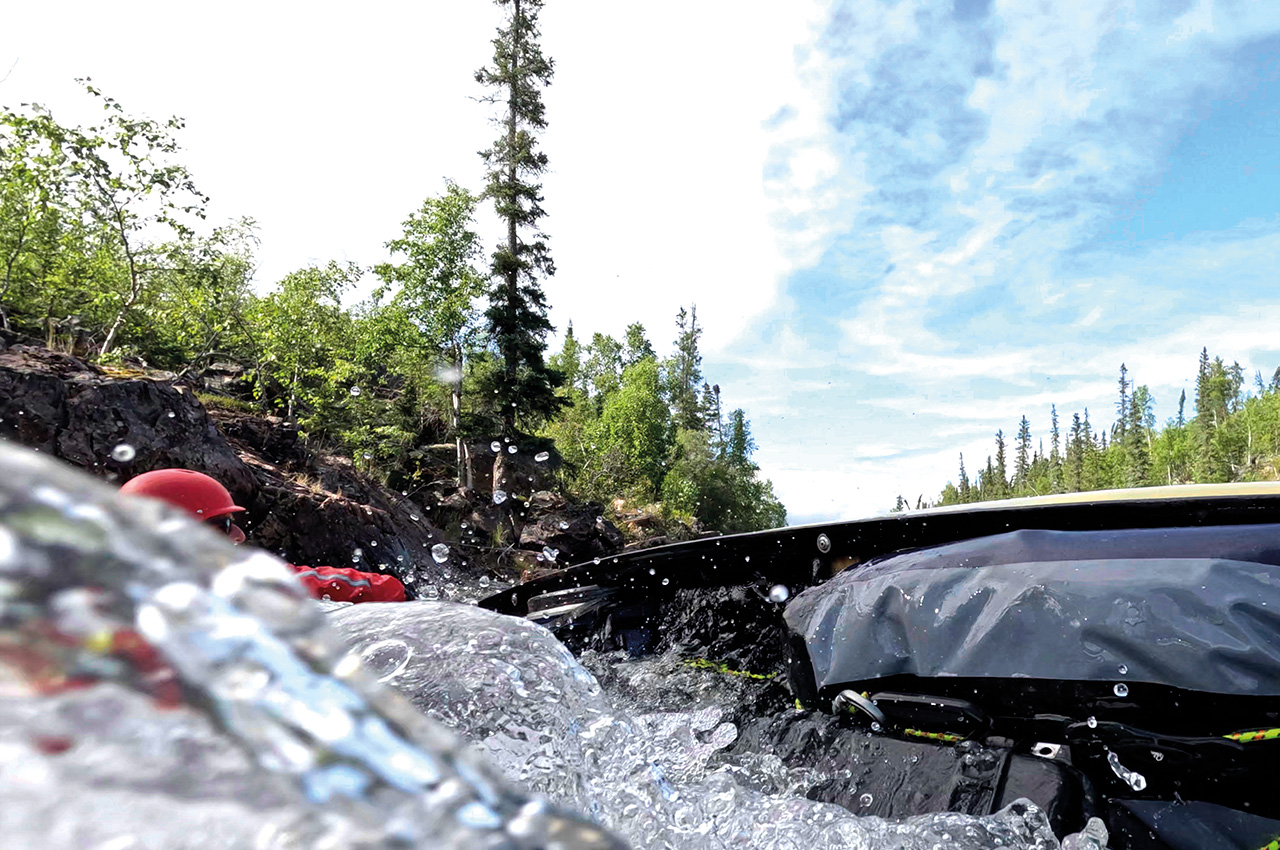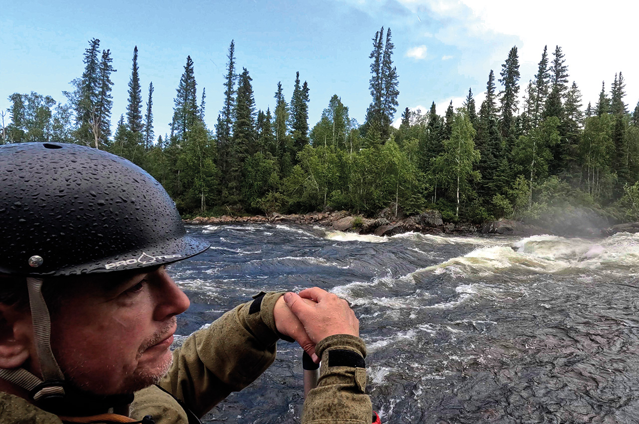 Next up was Big Spruce Rapid. ‘Class 2+/3 Steep with many boulders.’ From the water, it didn’t look appealing. Big waves everywhere, and a mass of white at the bottom left. It was agreed that Paul and Henry would scout the left bank. Shortly after they left, I felt the urge to see for myself. We were not taking the group with us as the terrain was so bad – a steep forest with deep moss covering a mess of dead trees and boulders. I was slow. Eventually, I got up to Paul and Henry. Paul turned to me, “There is a line… but you will not like it.”