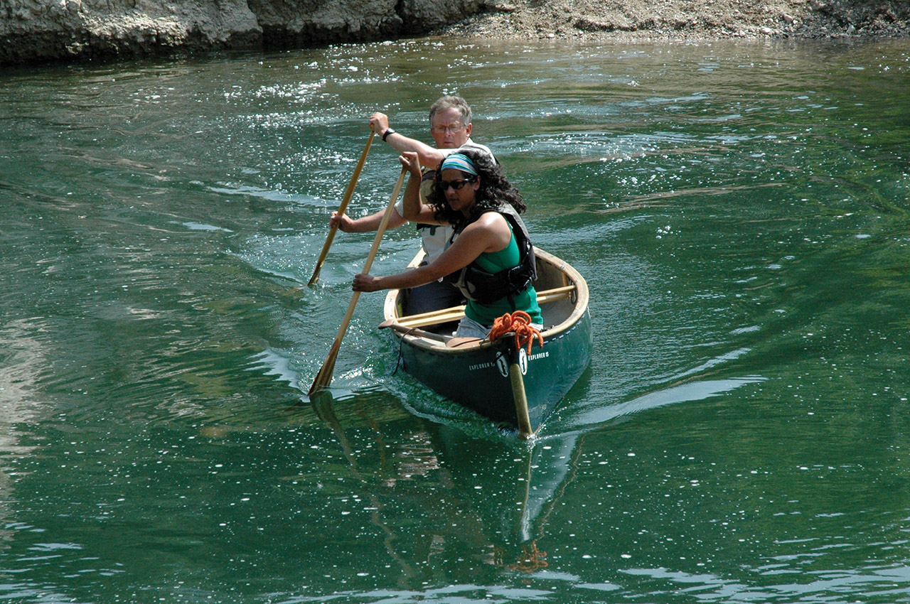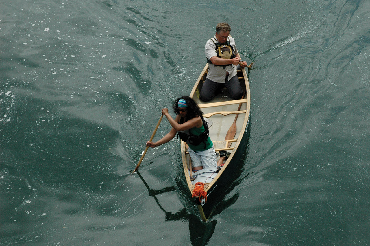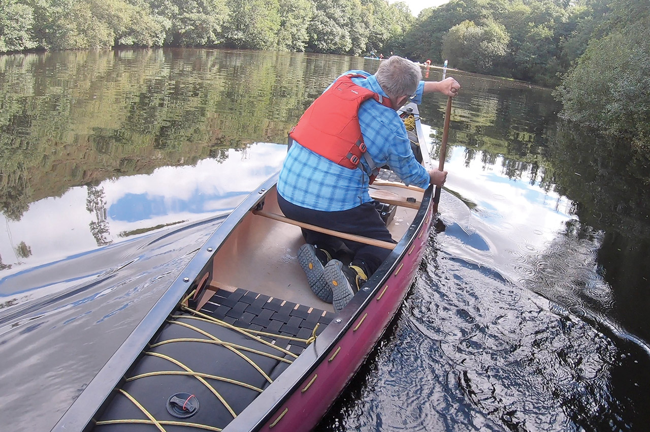 There is rarely a perfect spot for the paddle, and the best of us will make minute adjustments as we move. The canoe often starts to turn rather than move sideways. If the canoe turns to the paddle side, close the blade’s angle so that it is slicing parallel to the boat and then move the paddle back and reopen. If it turns away from the paddle side, move the blade forwards. A real key is not to give up if the canoe starts to turn but to keep with it and move the blade.
