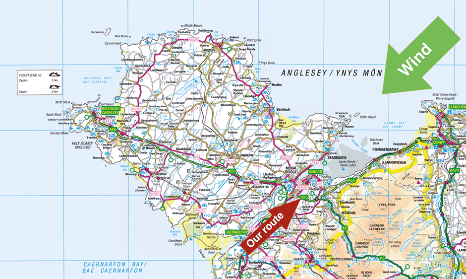 In the days before the trip, Dave came up with a plan, using the wind forecast to start near Caernarfon and do a clockwise circumnavigation. But the best laid plans changed with the latest forecast. None of us wanted to be in a strong east wind on the west coast, and with tide races towards the end of the day. The plan changed, and we would go east on the Menai Strait, into the wind, but have a better wind direction on the subsequent days.